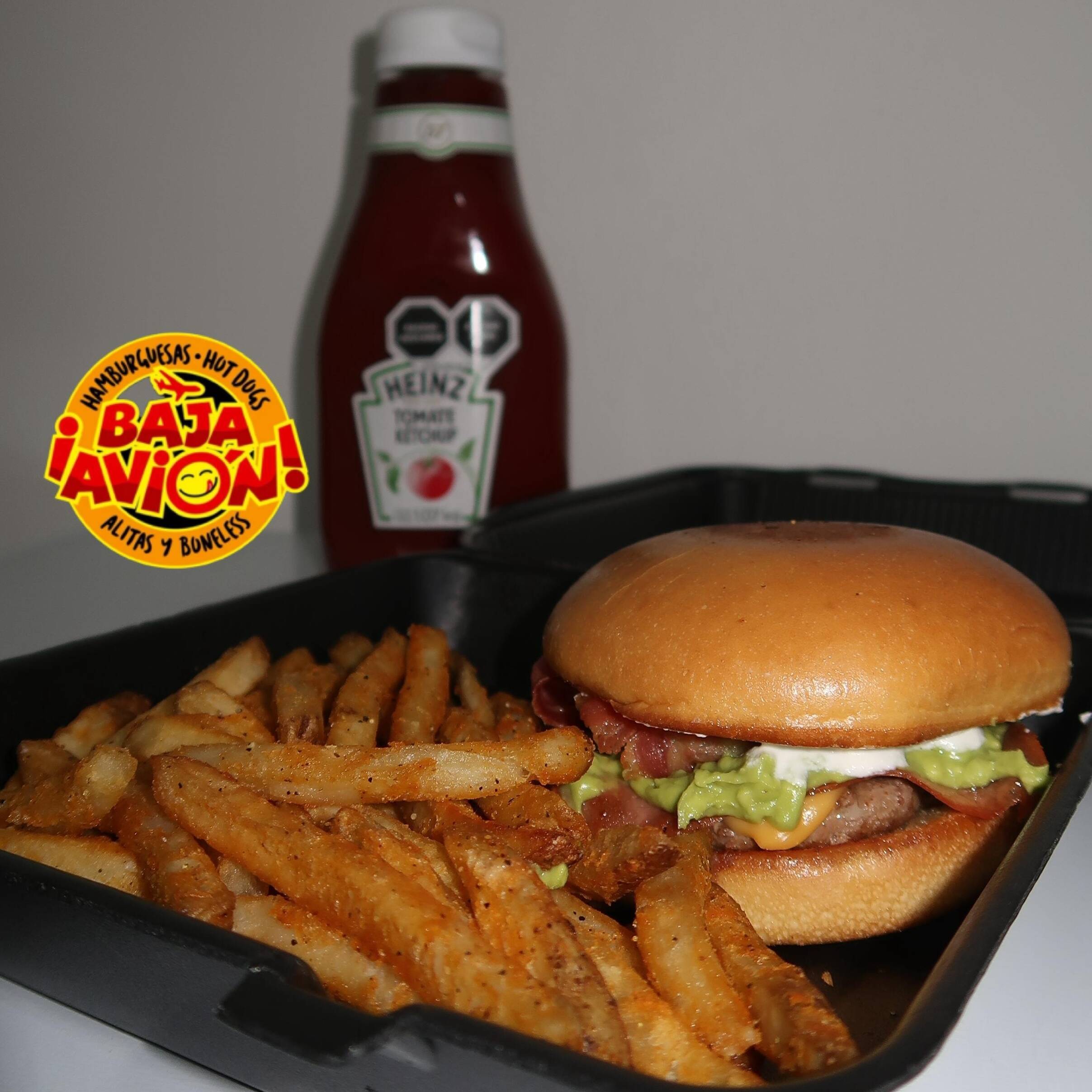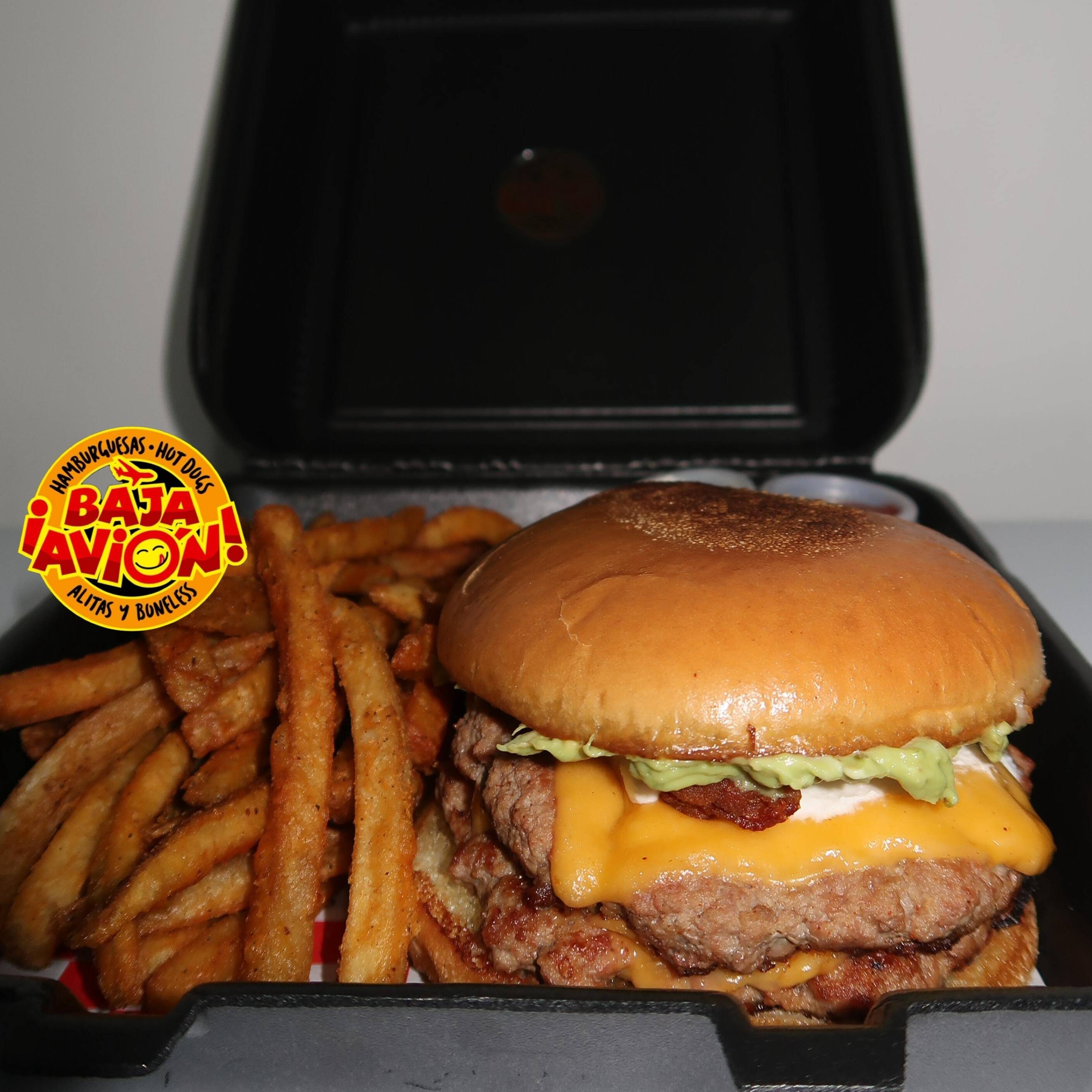 Doble carne, jamon, tocino, queso americano, queso philadelphia y guacamole.