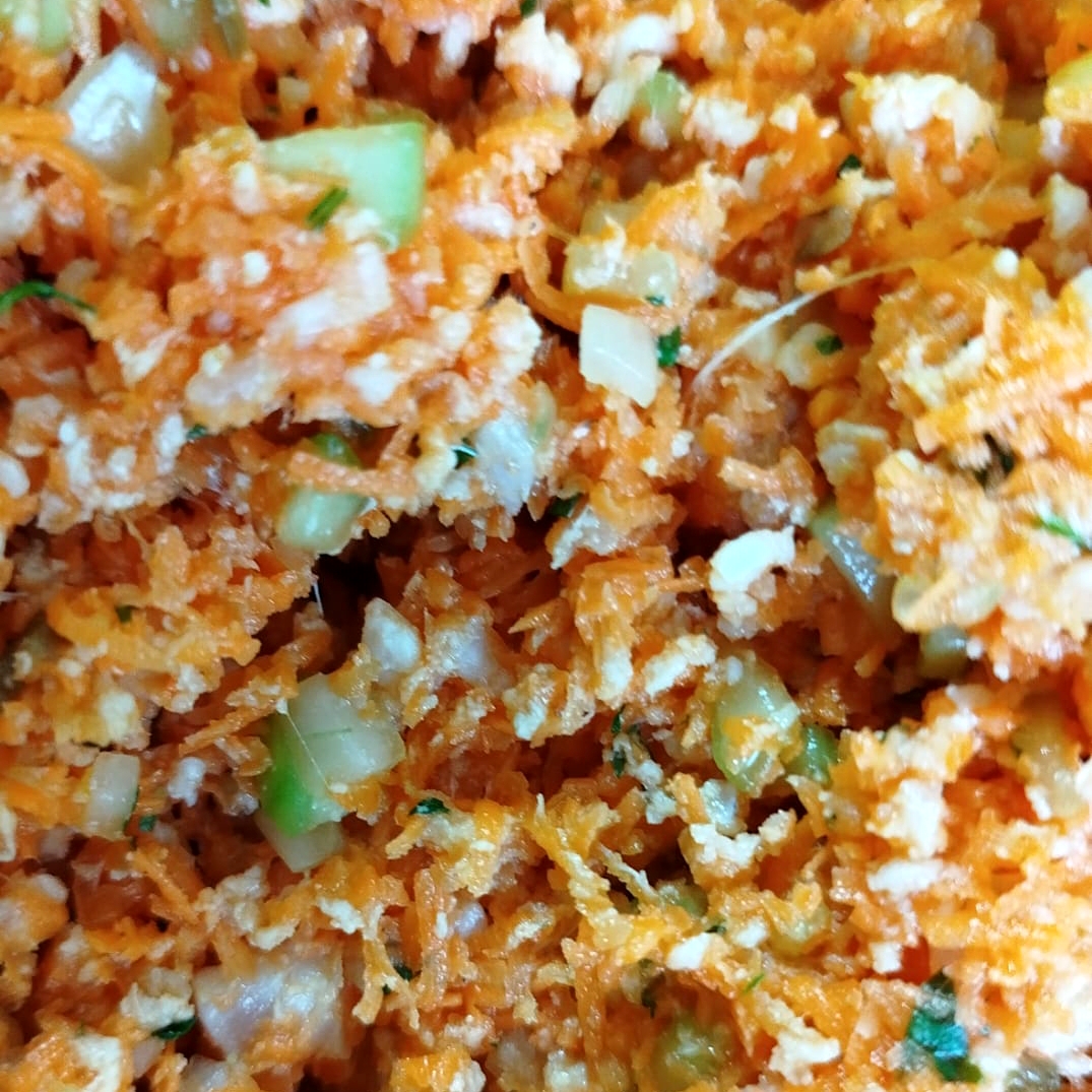 Guiso de camarones a los 3 quesos, apio y cebolla, en tortilla tatemada al comal, acompañados de ensalada de lechuga, col morada y cebolla, con aderezo de chipotle y chile caribe con serrano.