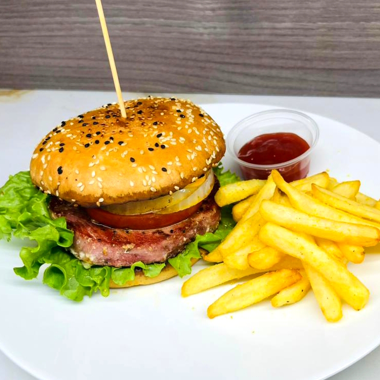 Medallón de atún, cebolla caramelizada, tomate, lechuga, acompañada de papas a la francesa.