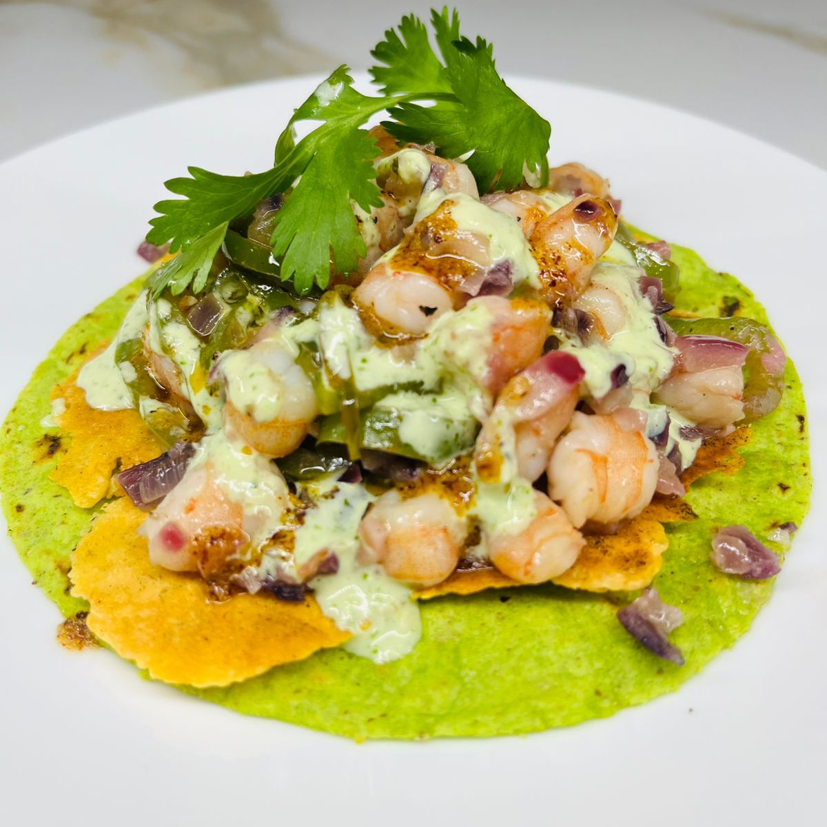 Camarones salteados con chile anaheim y cebolla, montados en una costra de queso y sobre una tortilla de nopal, con aderezo de chile caribe, serrano y cilantro.