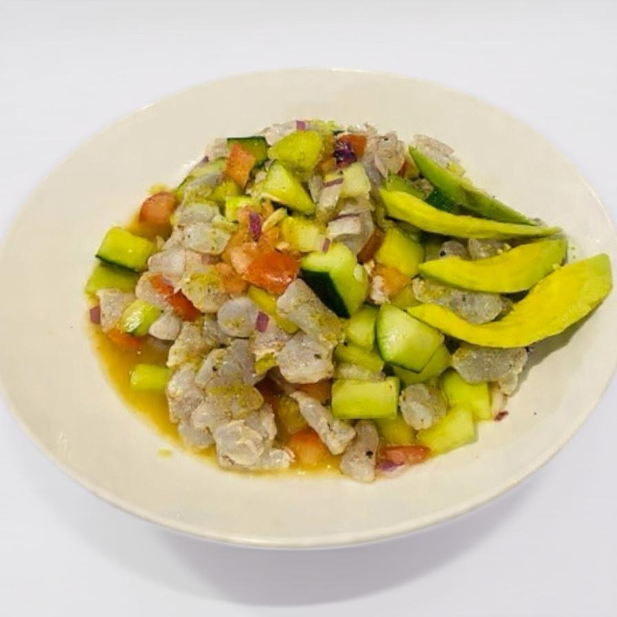 Camarón cocido y seco, atún, pepino, cebolla, cilantro, salsa coctelera y jugo de limón, acompañado de salsa negra de la casa.