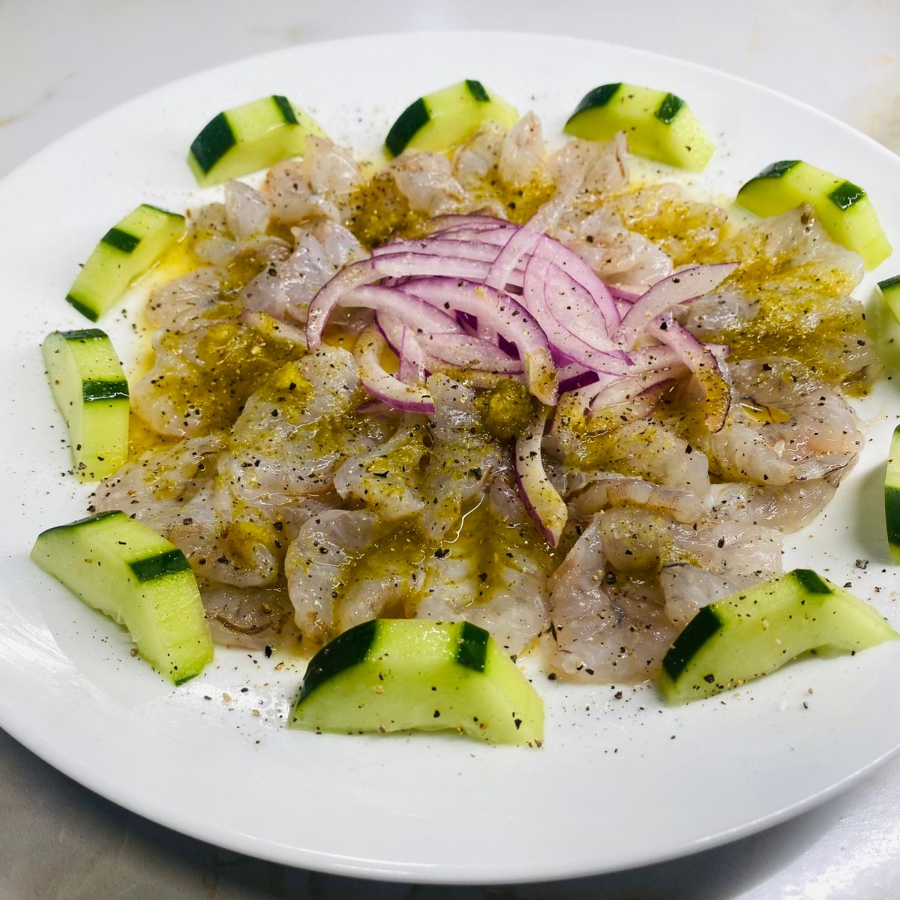 Camarones en mariposa, con cebolla morada, pepino, salsa verde molcajeteada, sal y pimienta.