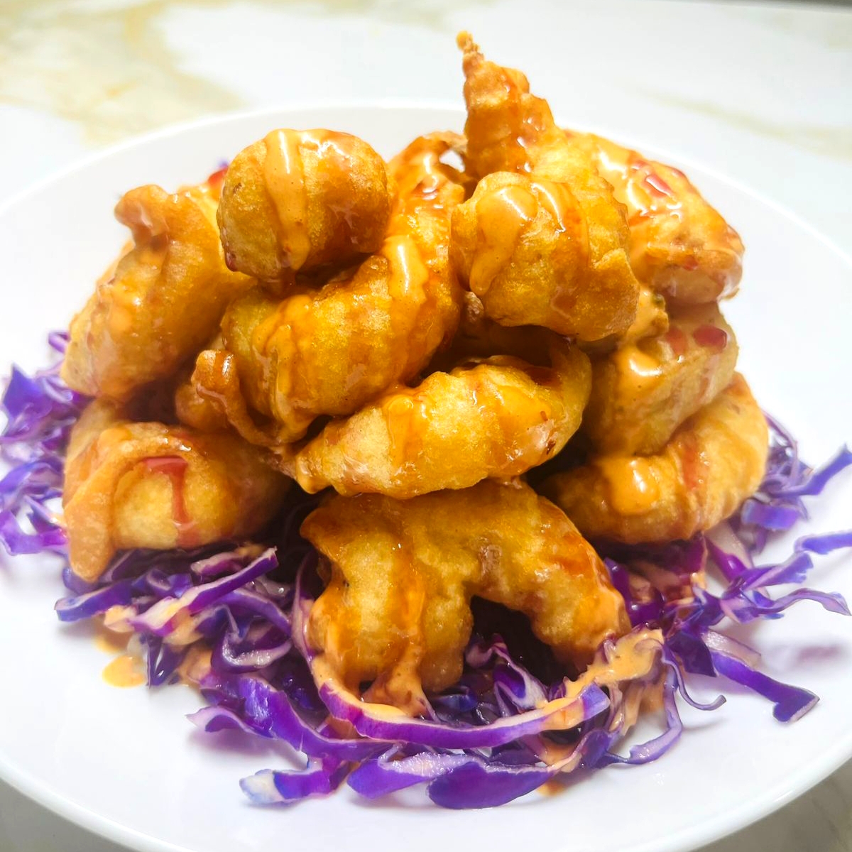 Camarones capeados en una mezcla especial de harinas, cerveza y otros; bañados en una reducción de vino tinto y aderezo de chipotle, sobre una cama de col moradal