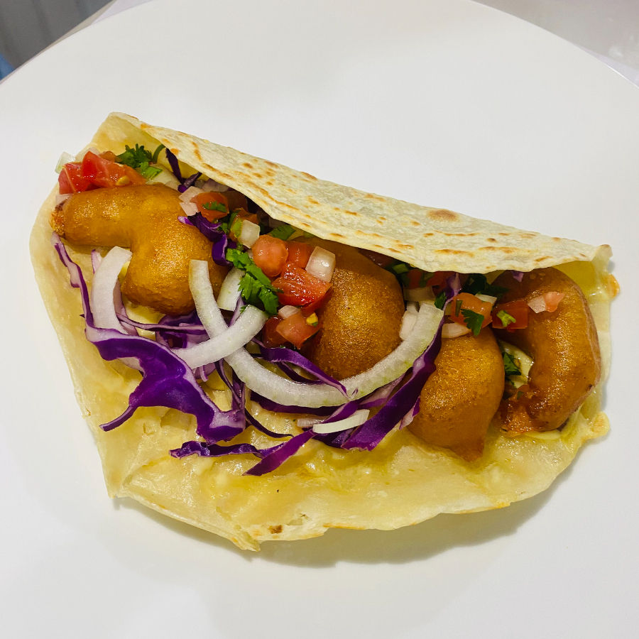 Camarones capeados en mezcla de harinas, cerveza y otros, mezcla de quesos, col morada, salsa cruda, aderezo de chipotle y de chile caribe con serrano.