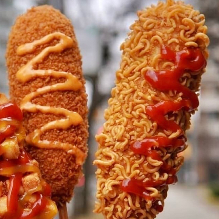 Banderilla coreana con relleno a elección y cobertura de ramen