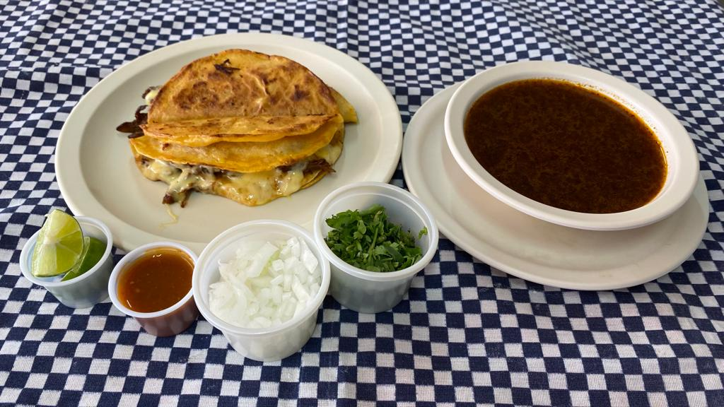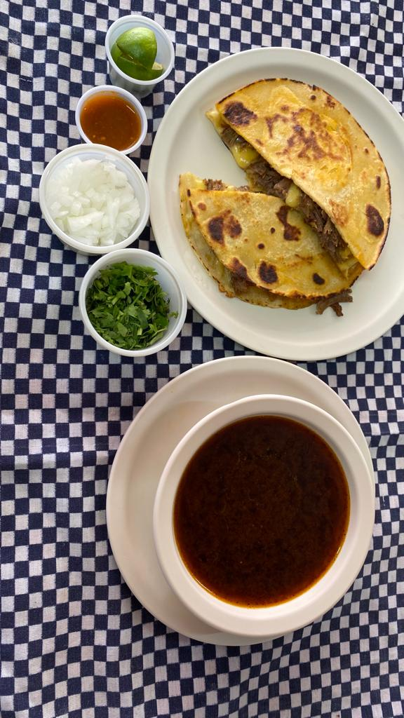 Deliciosa birria de res en tortilla de harina, acompañada de queso gouda La Villita, cebolla blanca, cilantro, limón, salsa roja y un consomé de birria de res de 6 oz.