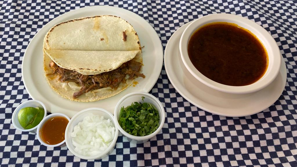 Tortilla hecha a mano, deliciosos tacos de birria de res, acompañados de un consomé de birria de res de 6 oz, cebolla blanca, cilantro, limón y salsa roja.