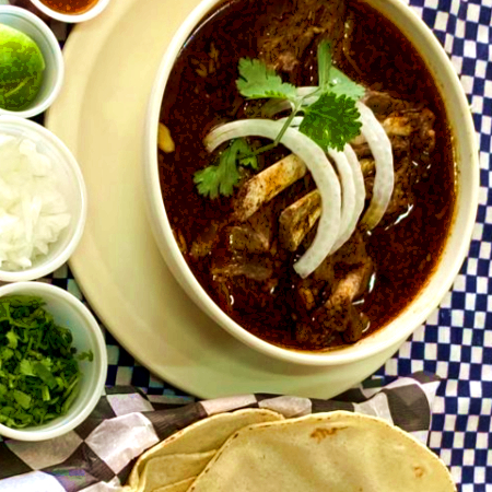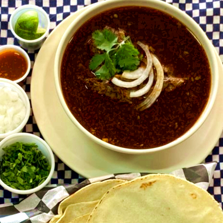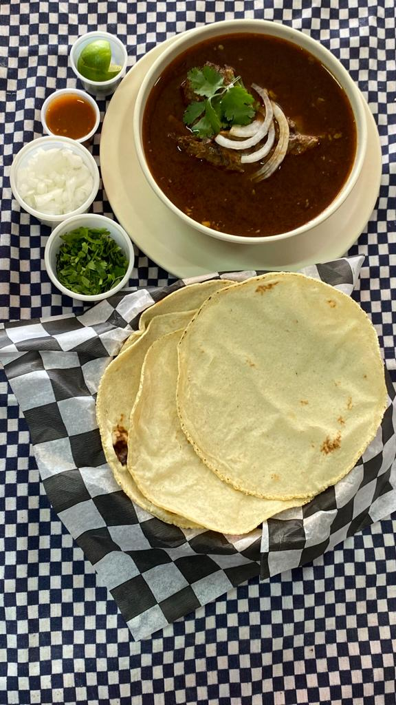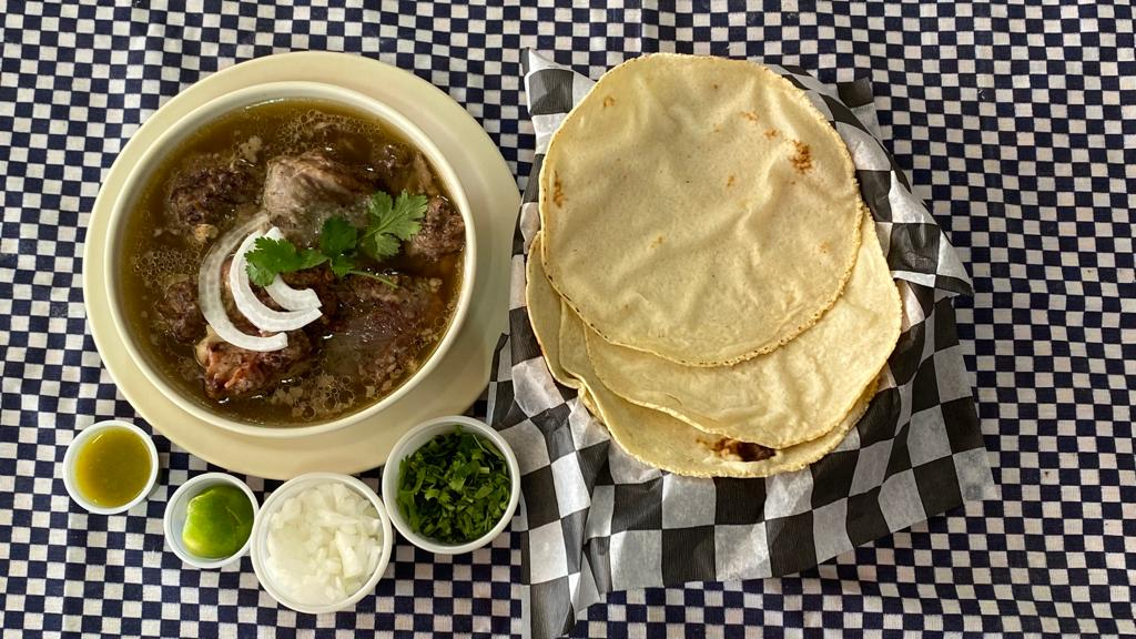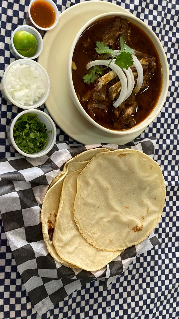 Deliciosa carne de chivo preparada en caldo, acompañada de cebolla blanca, cilantro, limón y salsa roja. Incluye 4 tortillas de maíz hechas a mano.