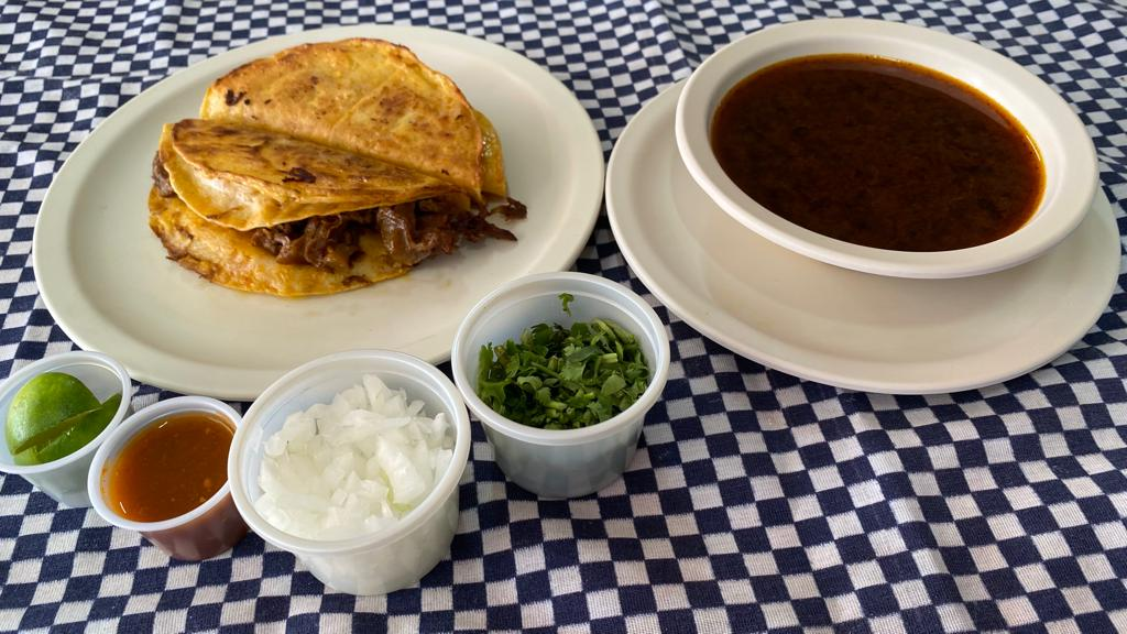 Deliciosos tacos con birria de chivo y queso gouda La Villita, acompañados de un consomé de birria de chivo de 6 oz, cebolla blanca, cilantro, limón y salsa roja.