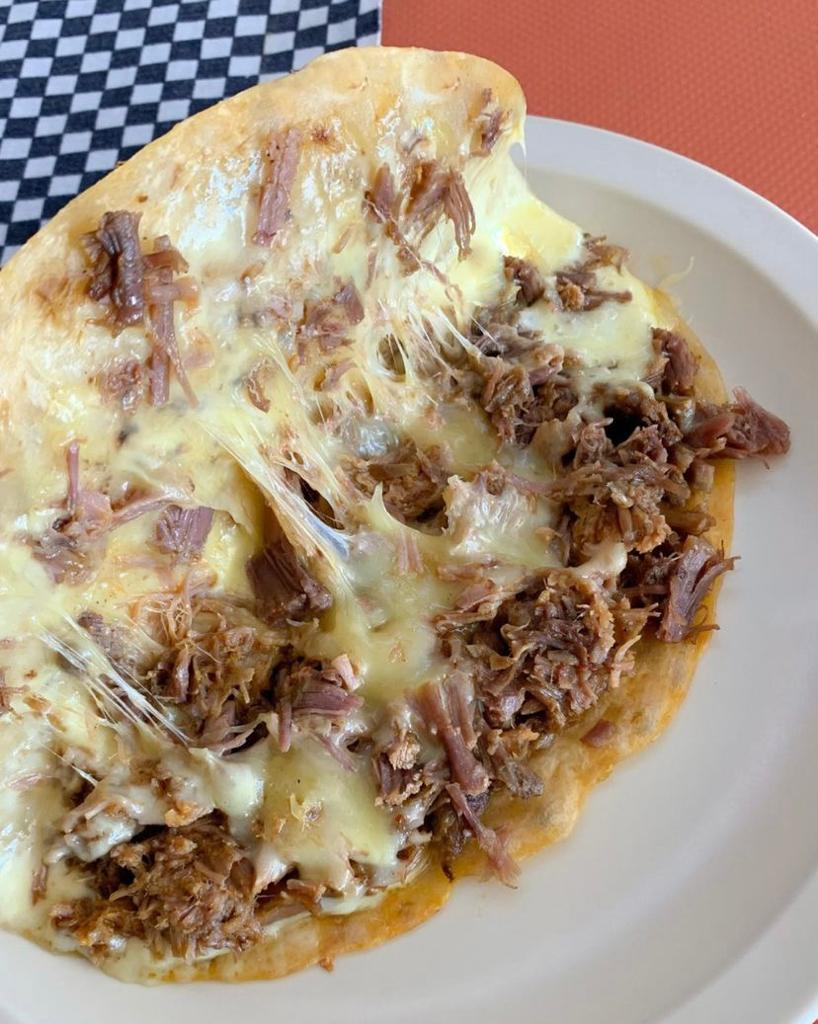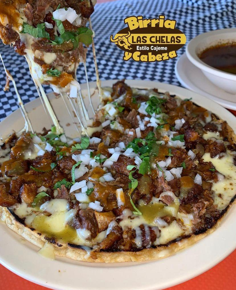 Del tamaño de una pizza individual con birria, asientos y queso gouda, partida en 4 pedazos.