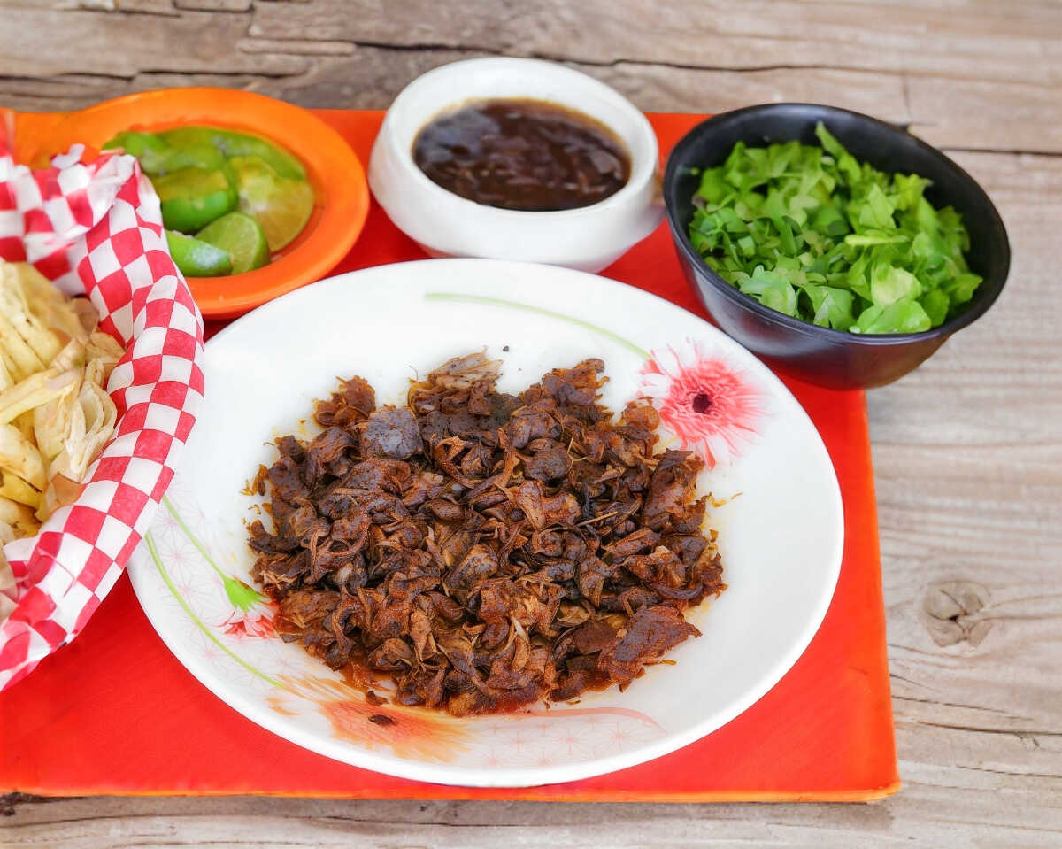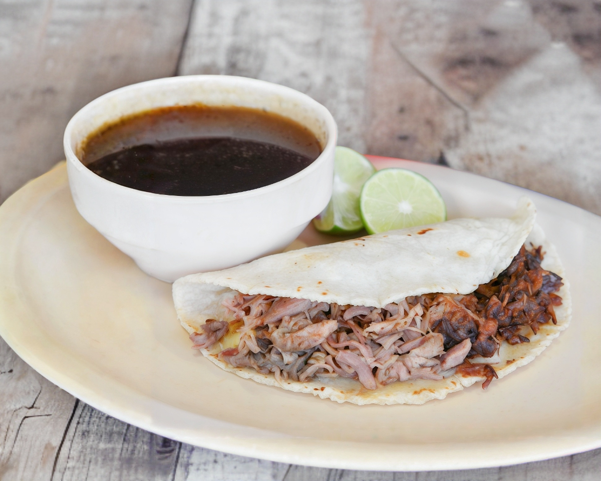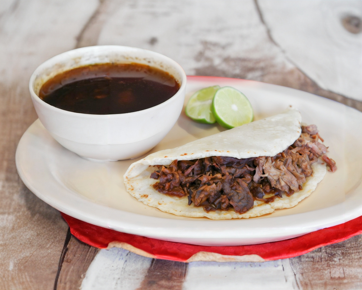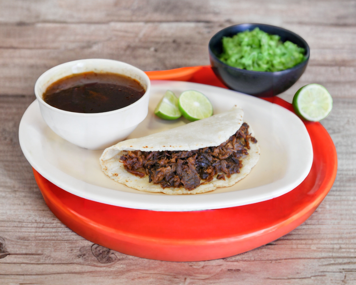 Carne normal y carne dorada tatemada, salsas, 5 tortillas, consomé, cebollas y limones.