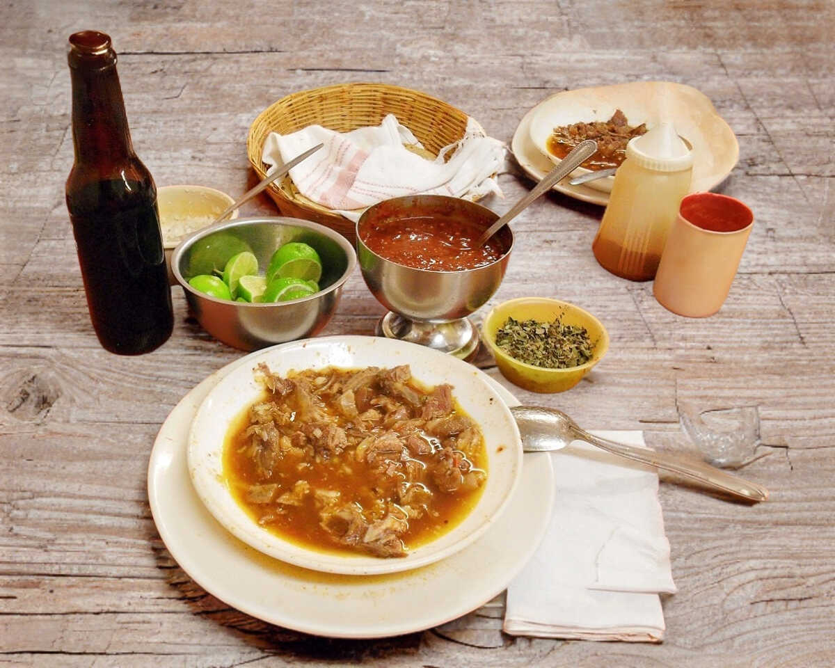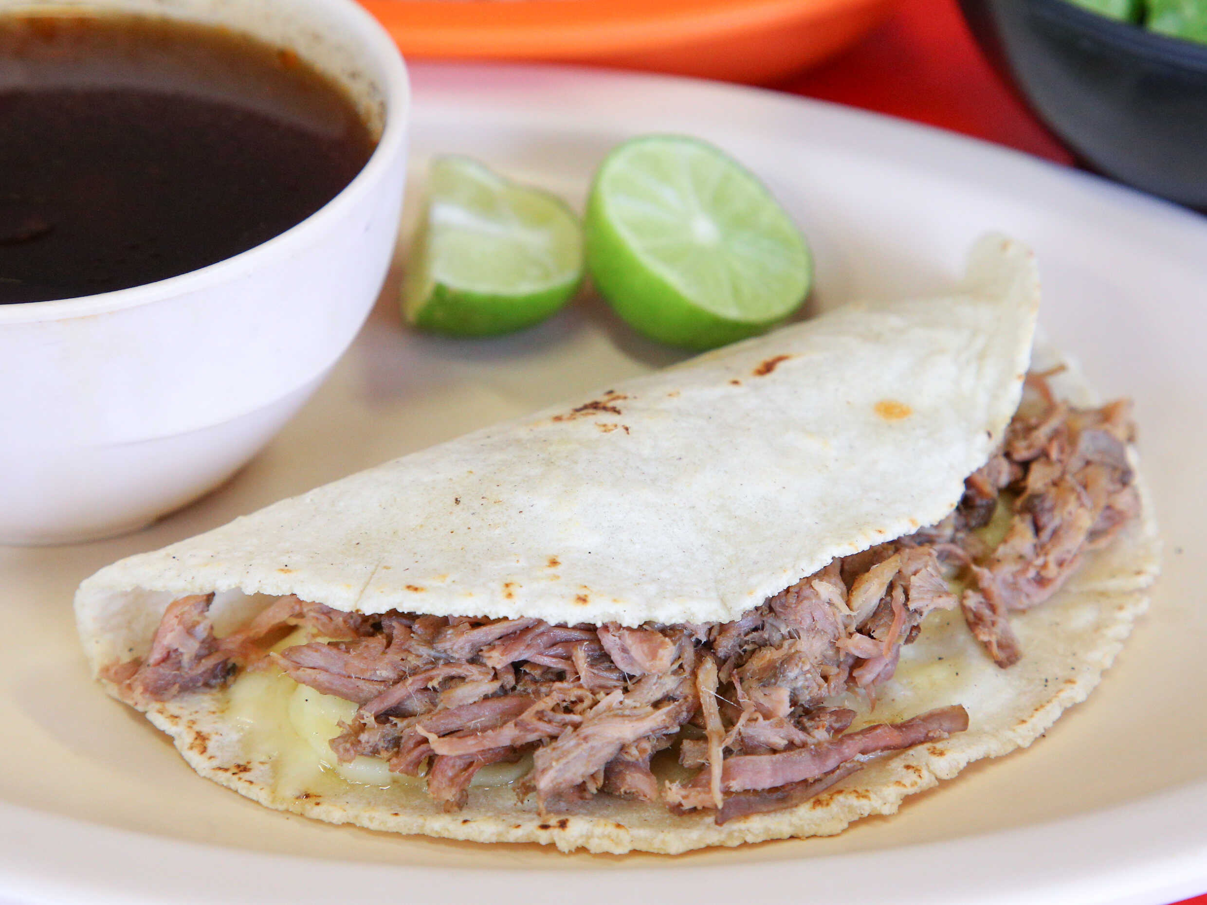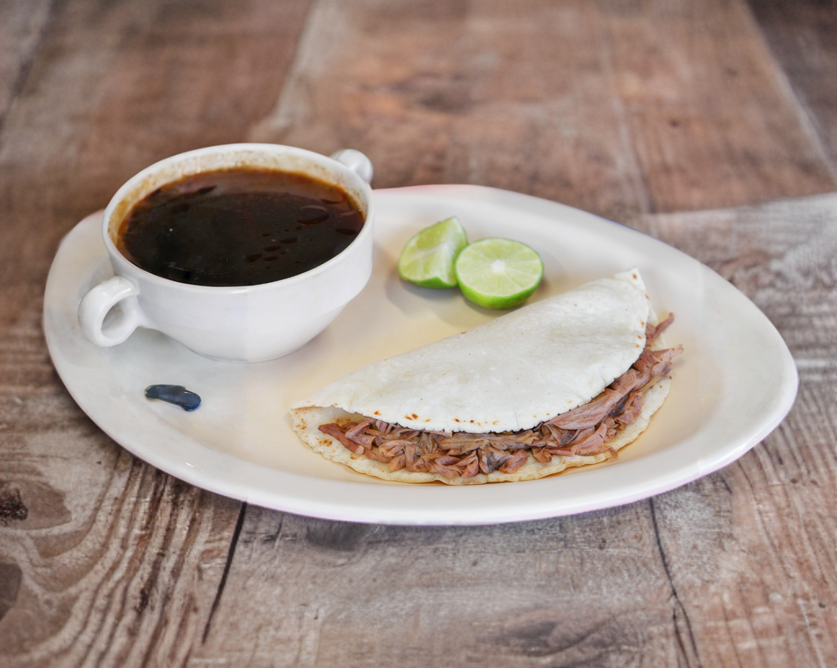 Carne normal y carne dorada tatemada, salsas, 5 tortillas, consomé, cebollas y limones.