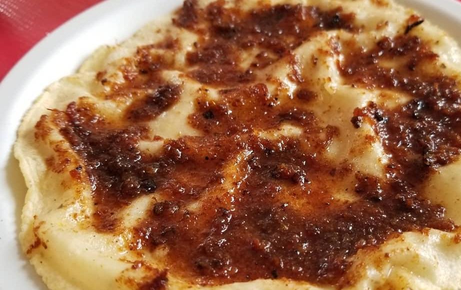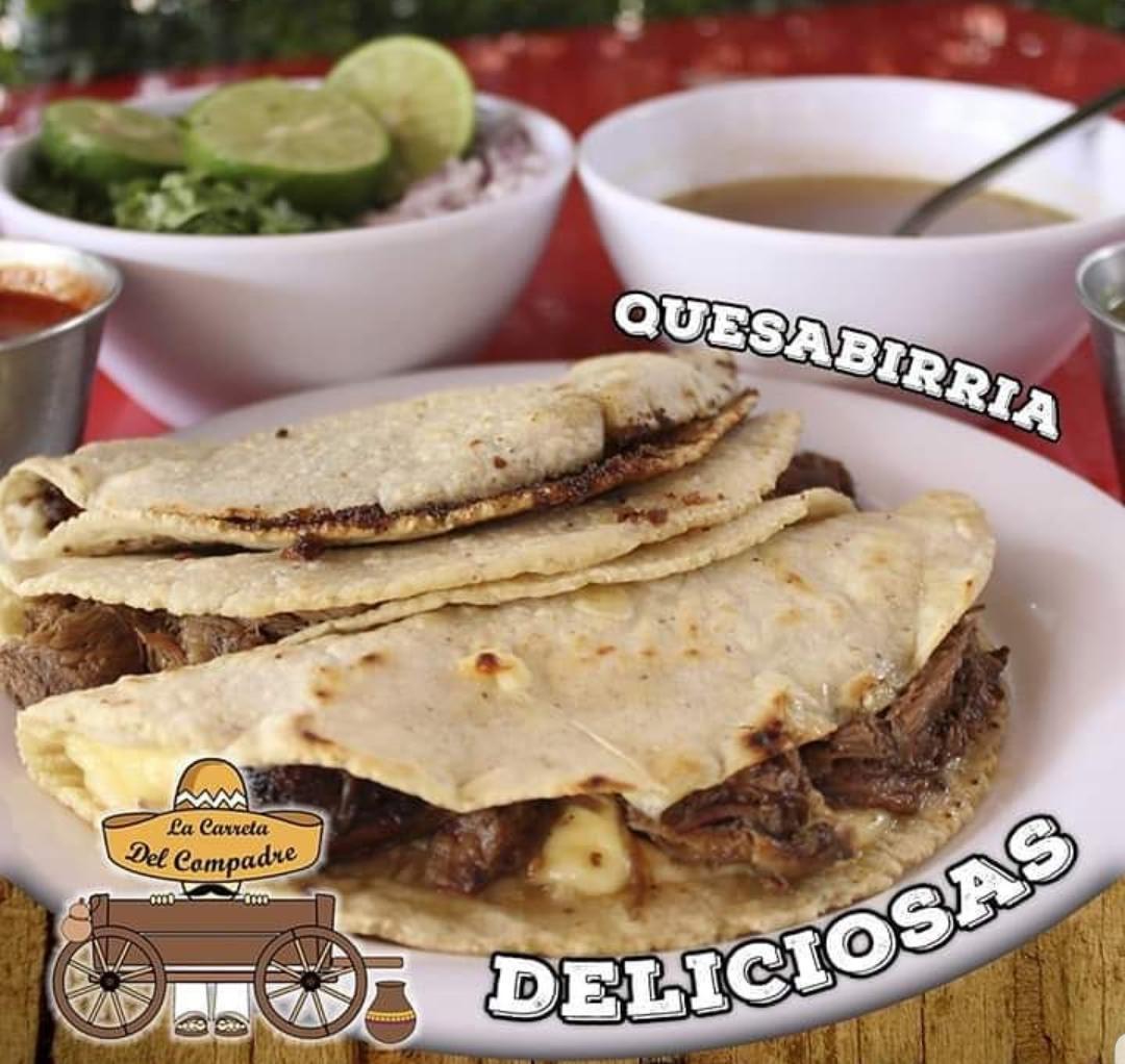 TORTILLA DE NIXTAMAL A MANO CON QUESO Y CARNE DE BIRRIA , CALDO DE BIRRIA.