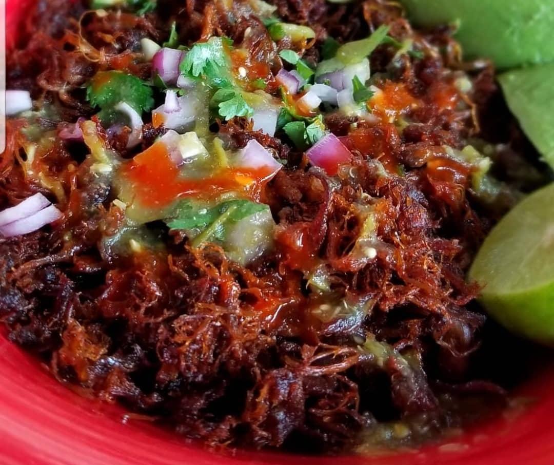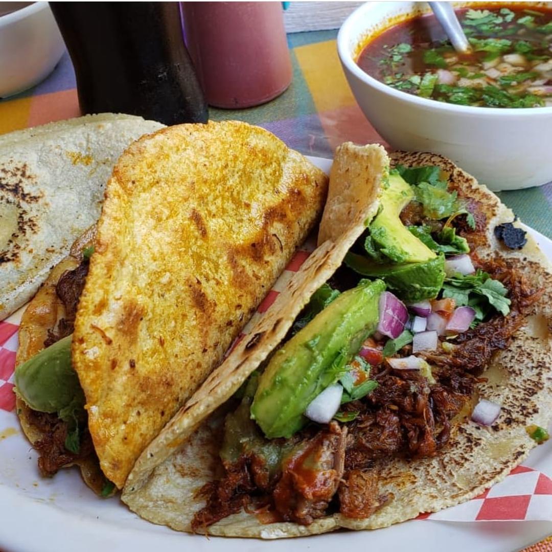 TORTILLA DE NIXTAMAL CON CARNE DE BIRRIA Y CALDO DE BIRRIA APARTE