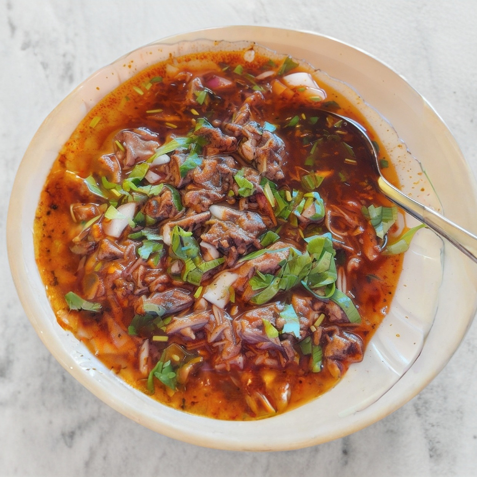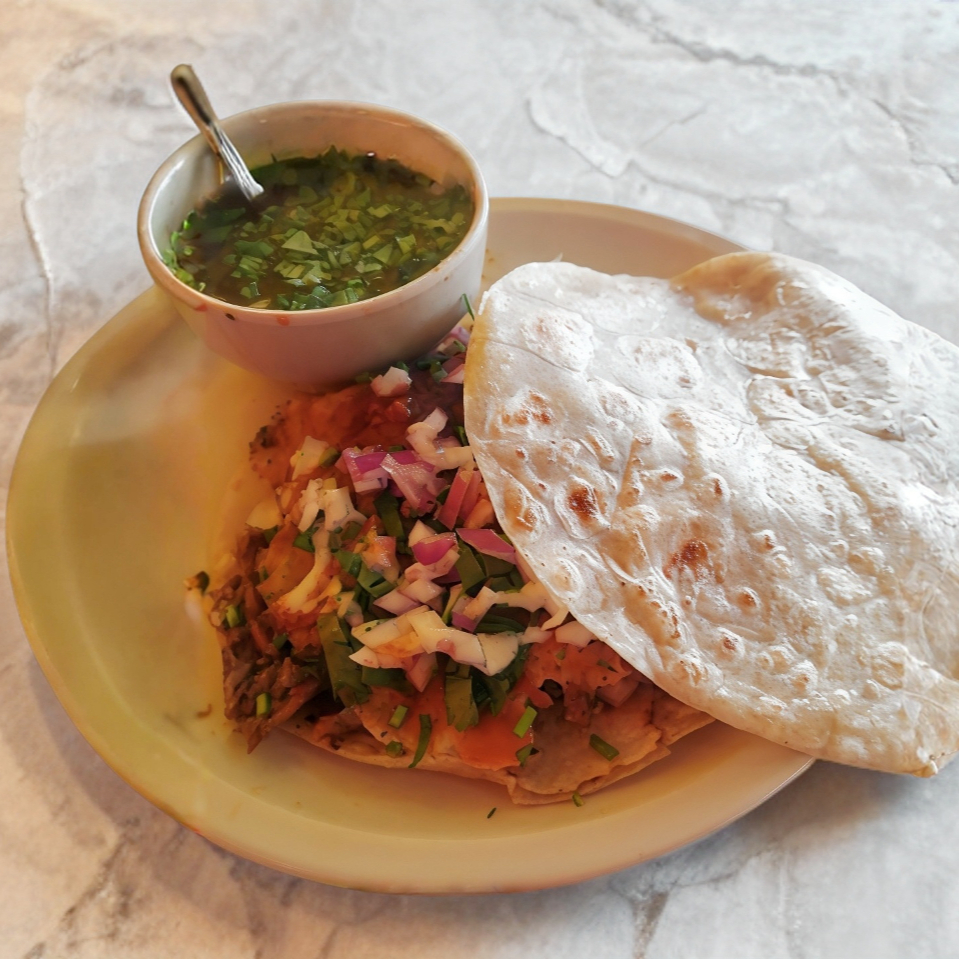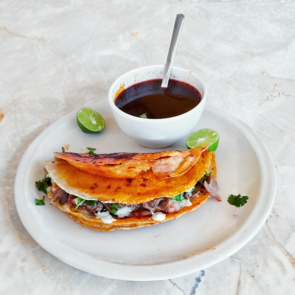 Carne, consomé y tortillas hechas a mano.
