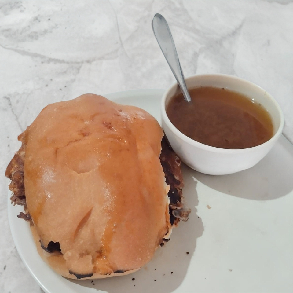 Tortabirria... Telera con carne de birria ,queso , consomé,salsa y verdura