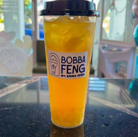 Base de té verde, cubos de hielo, sabor lychee, con topping de perlas explosivas de lychee y jelly de yogo mix más trozos de naranja.