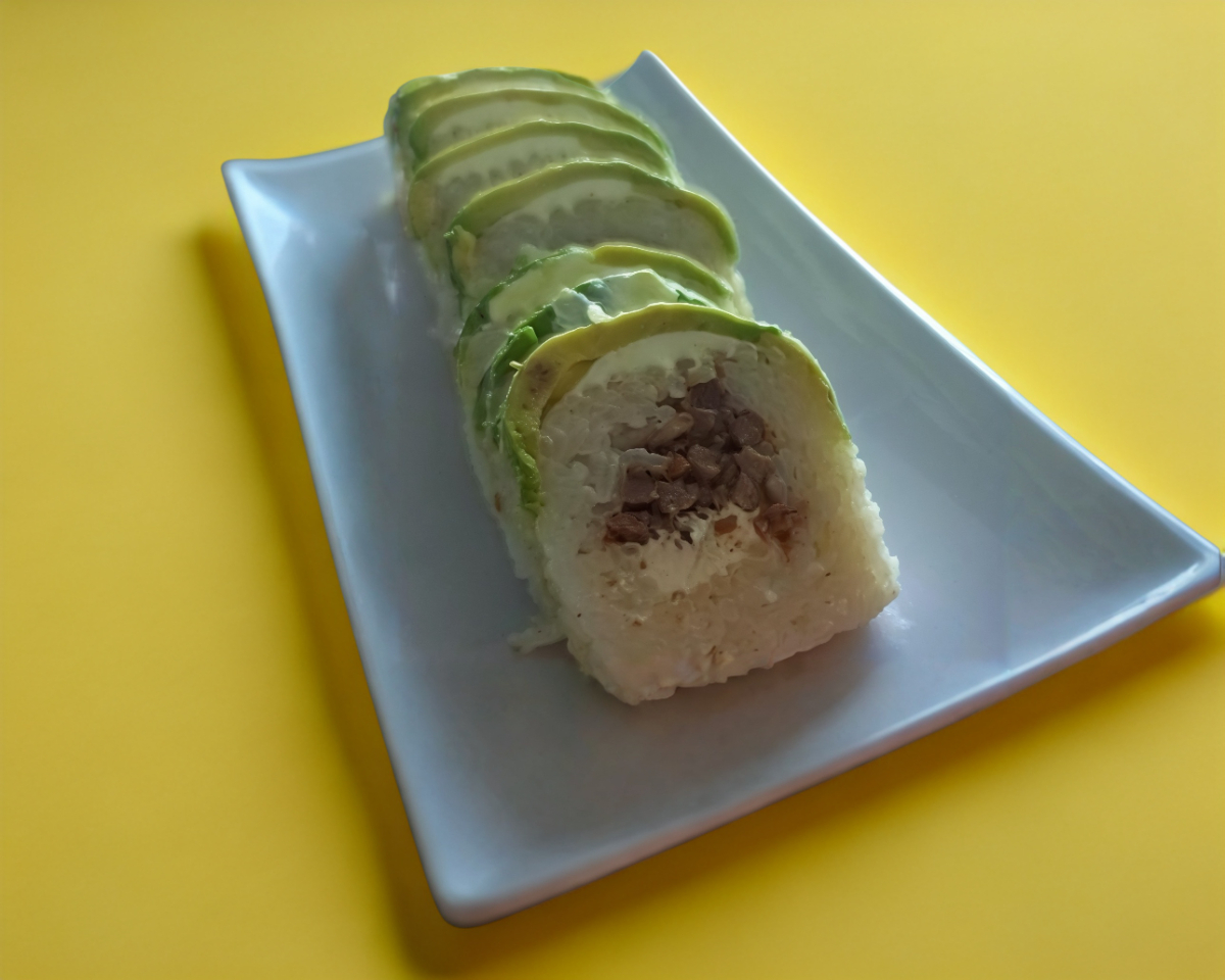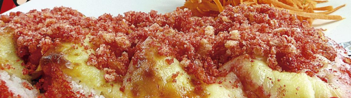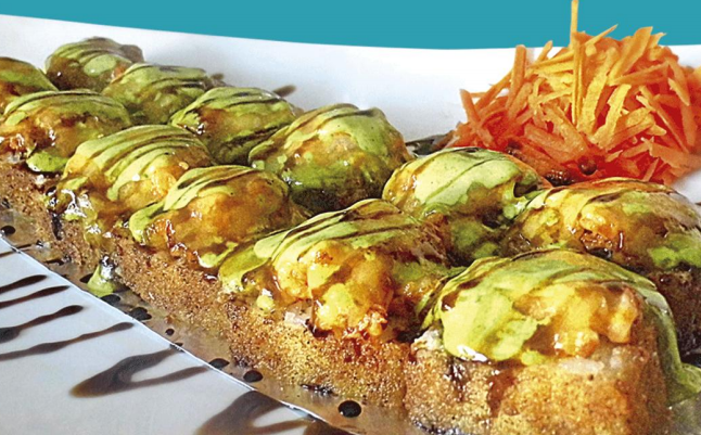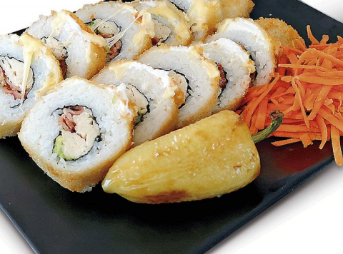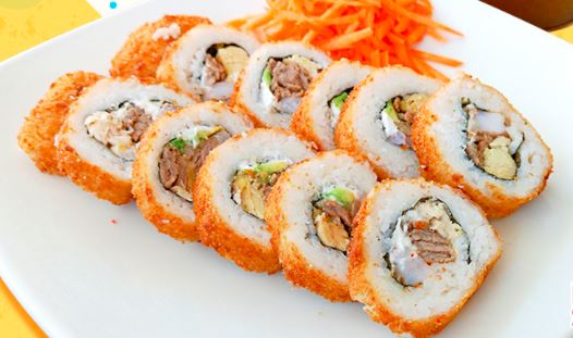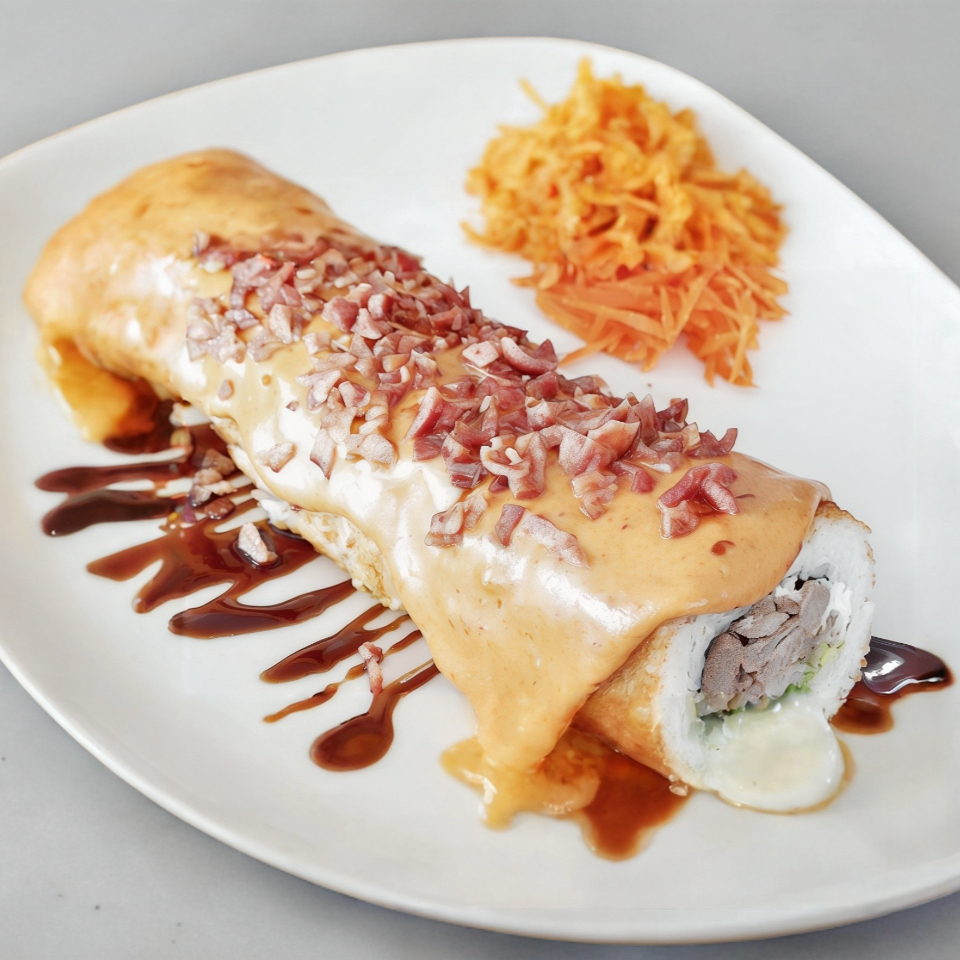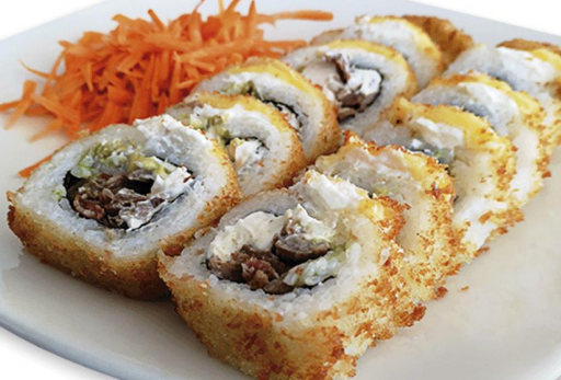 Rollo empanizado con phila aguacate, gratinado con res frita por arriba.