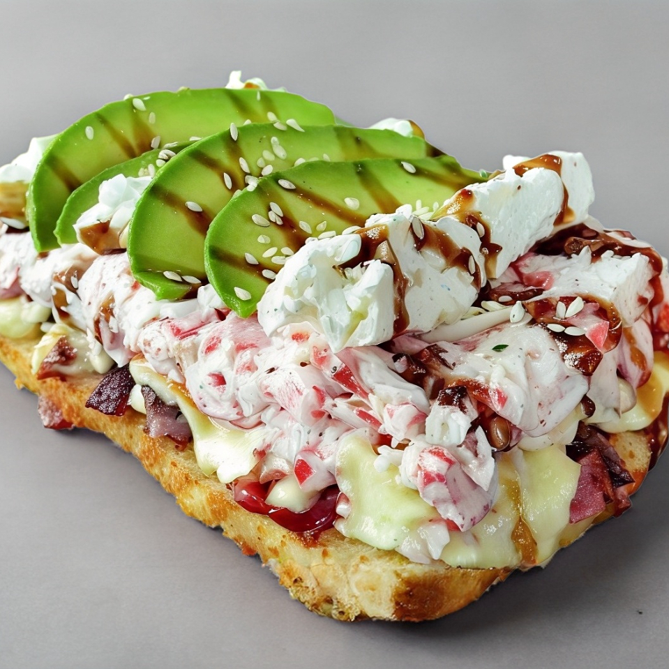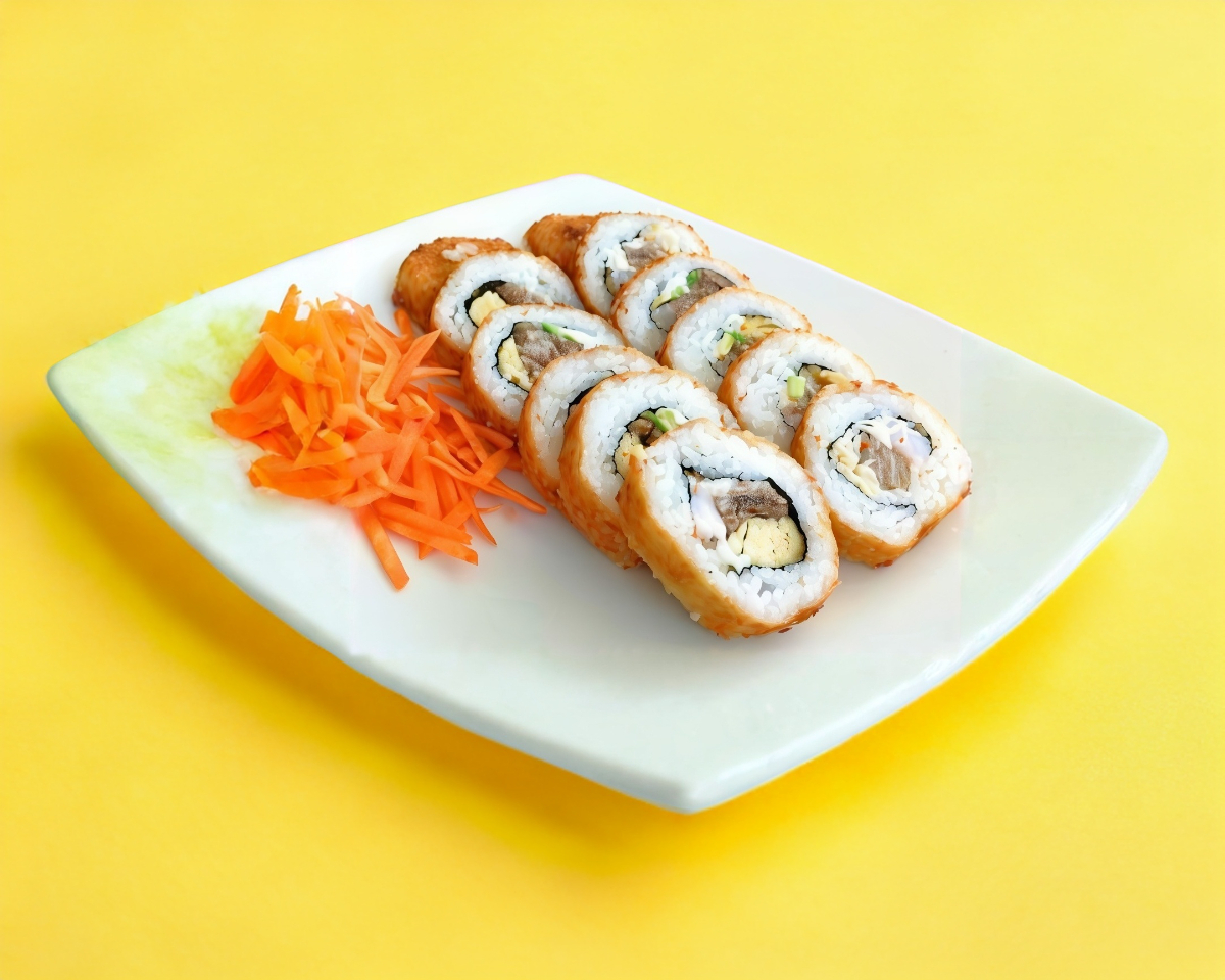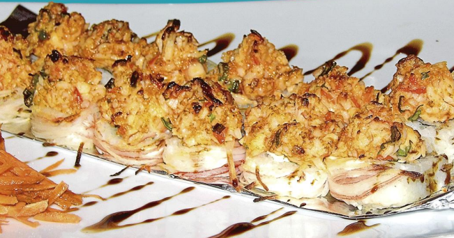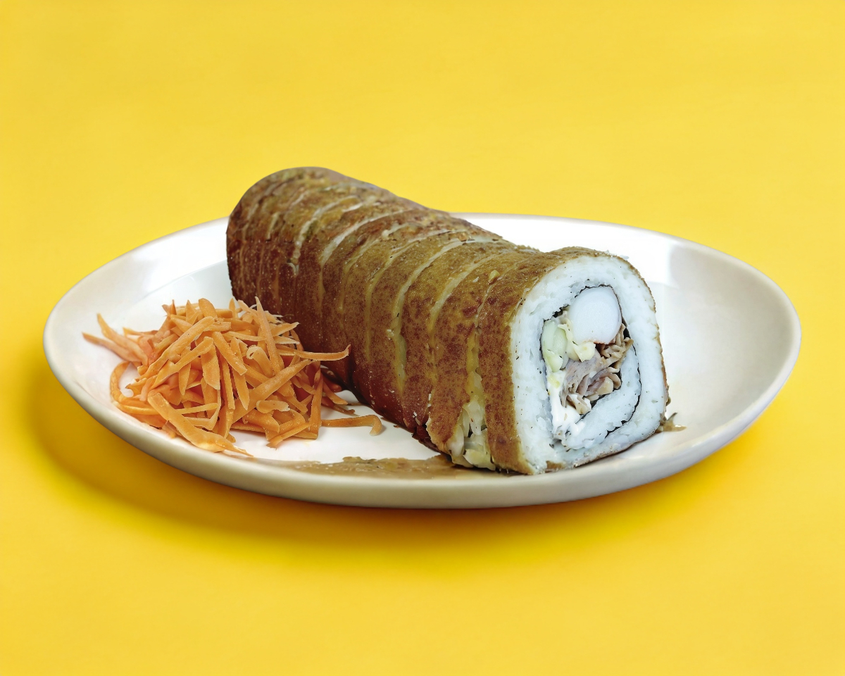 Rollo empanizado con phila aguacate, gratinado con res frita por arriba.