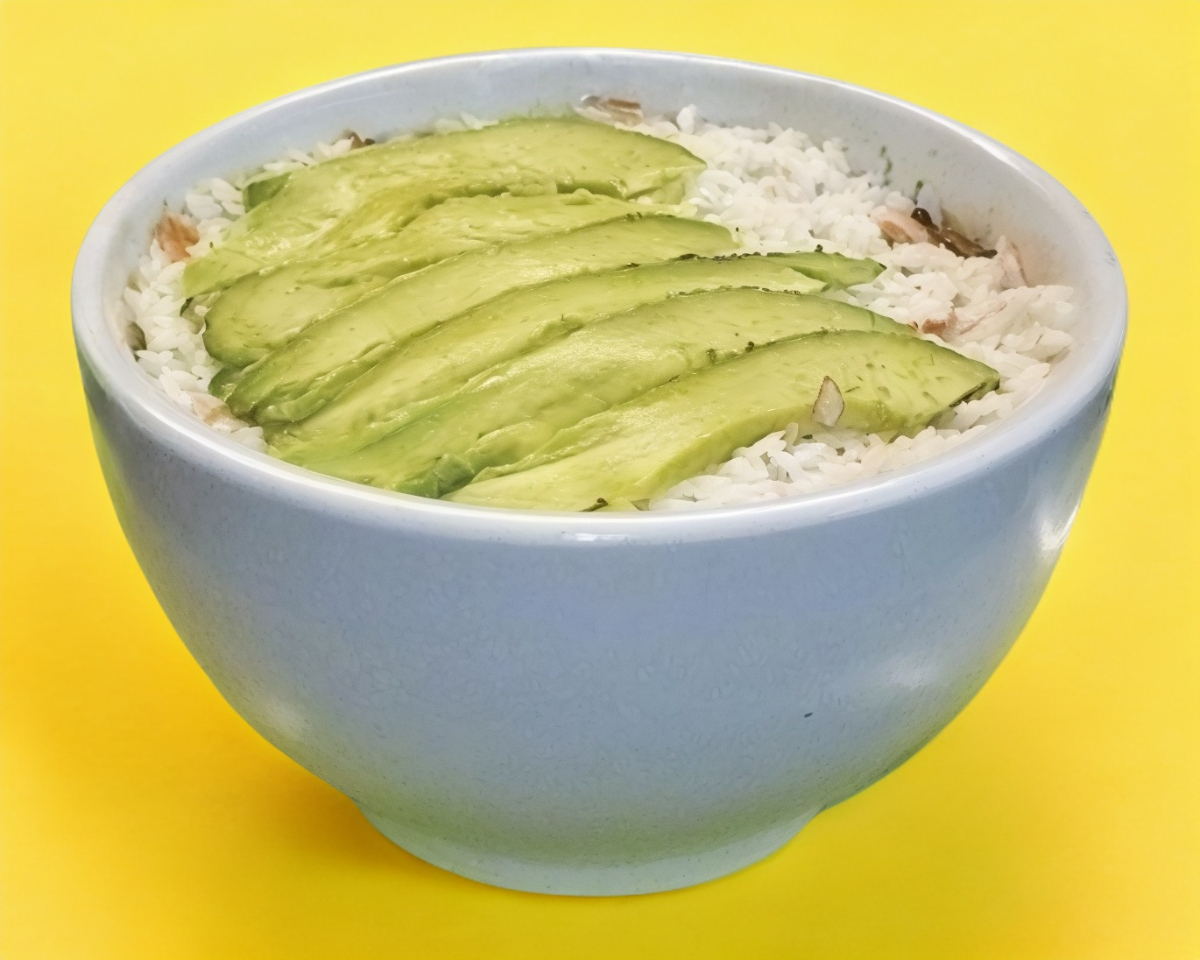 Arroz frito con pollo res y camarón, phila, tampico y aguacate arriba.