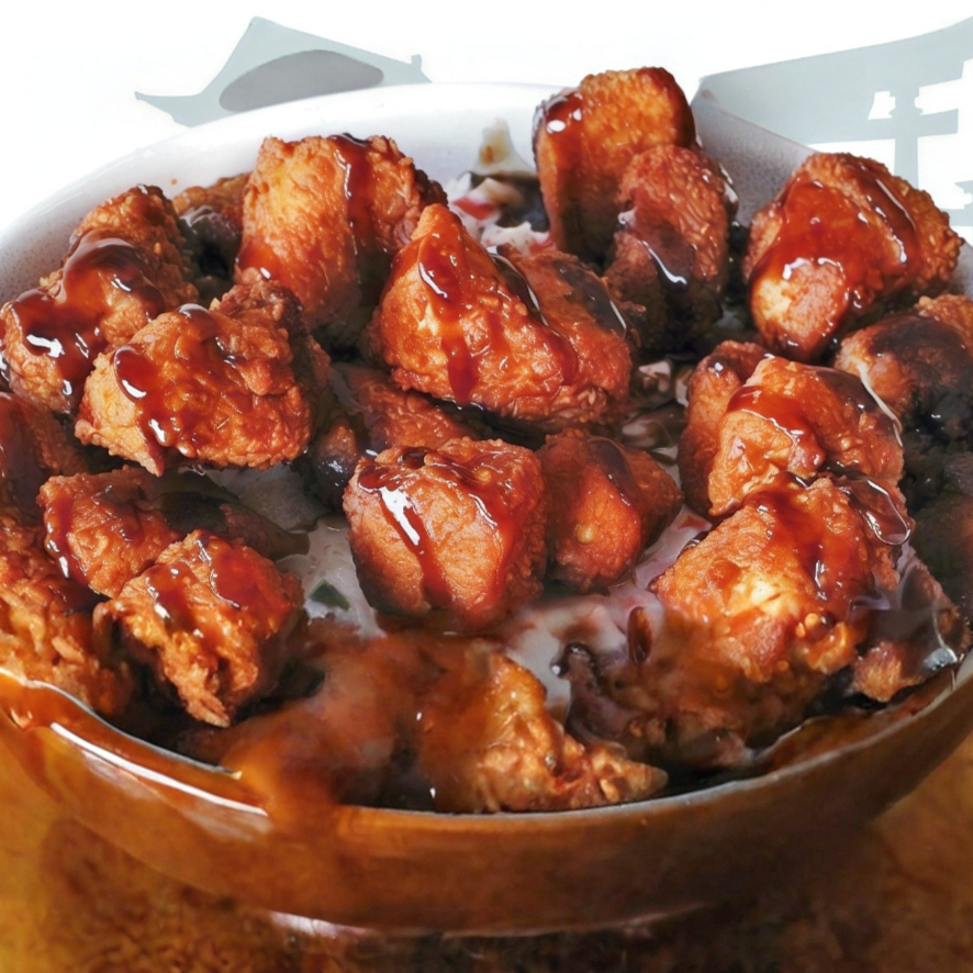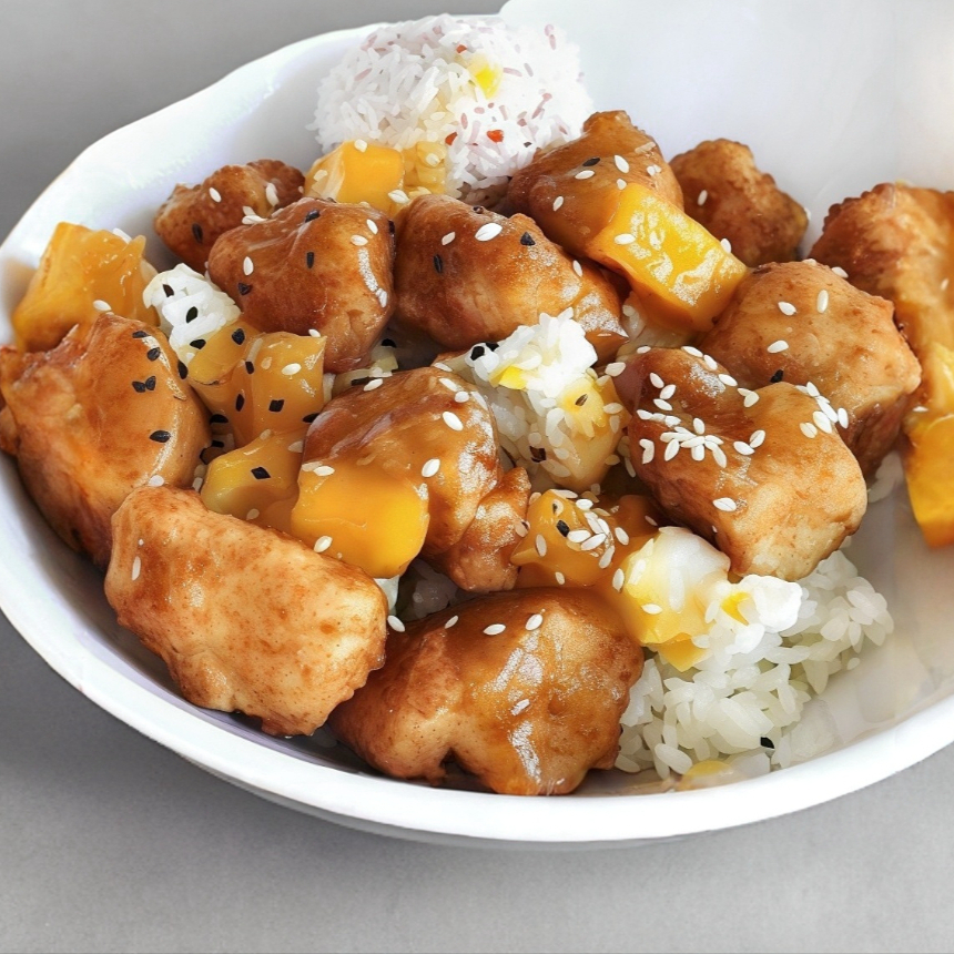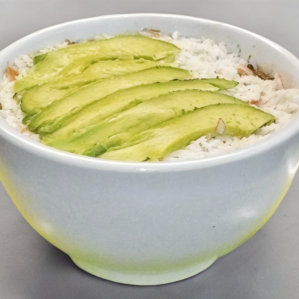 Arroz blanco phila y Tampico, coronado con pollo empanizado y salsa de anguila.