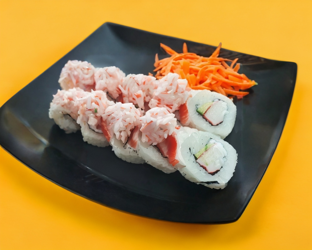 Rollo de Marlín, camarón y aguacate por dentro, phila y aguacate por fuera.