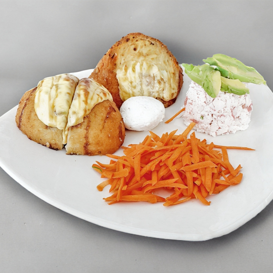 Bola de arroz empanizada, en el centro pollo res y camarón, gratinada, acompañada con una copa de arroz blanco, un porción de phila y aguacate, con salsa de anguila.