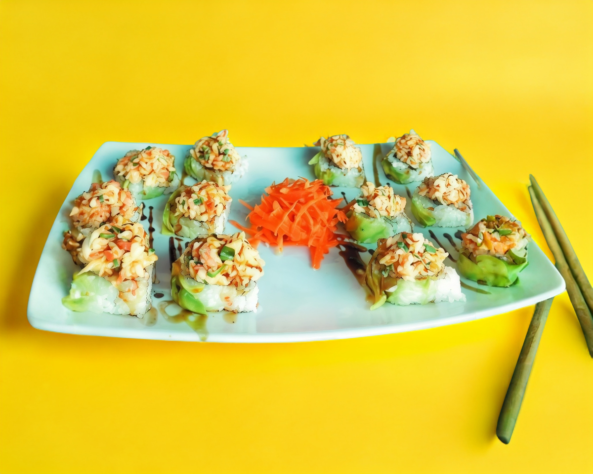 Rollo de cangrejo y aguacate por dentro, por fuera phila y cangrejo, coronado con tampico topping.