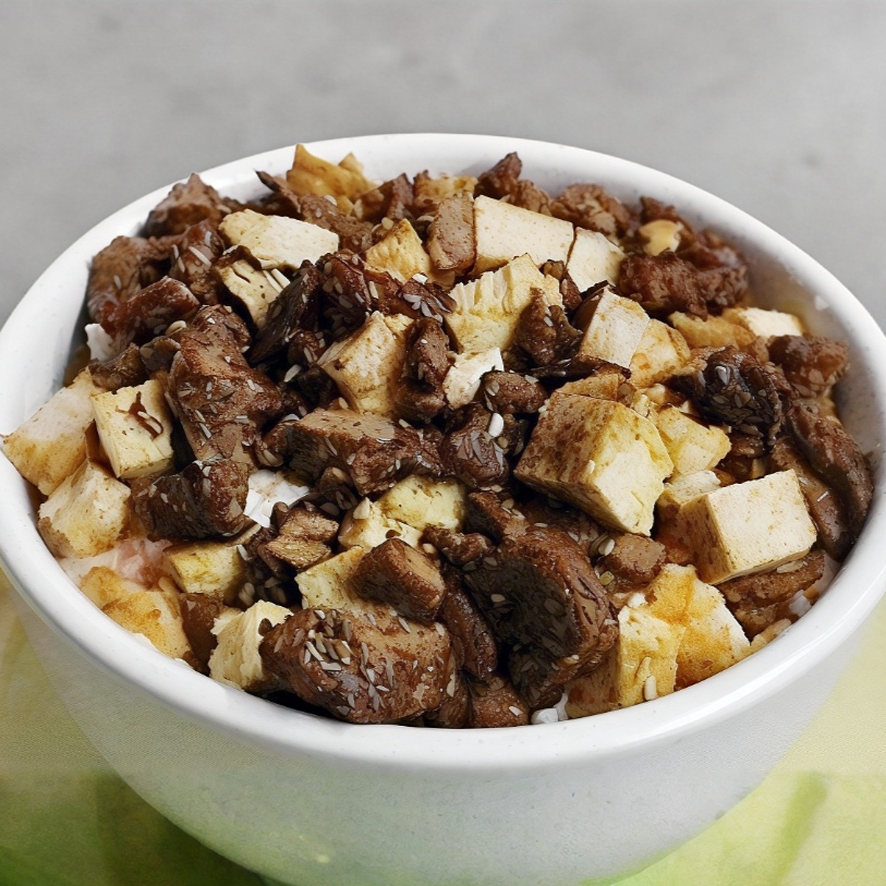 Arroz blanco phila y tampico, arriba pollo res y camarón fritos.