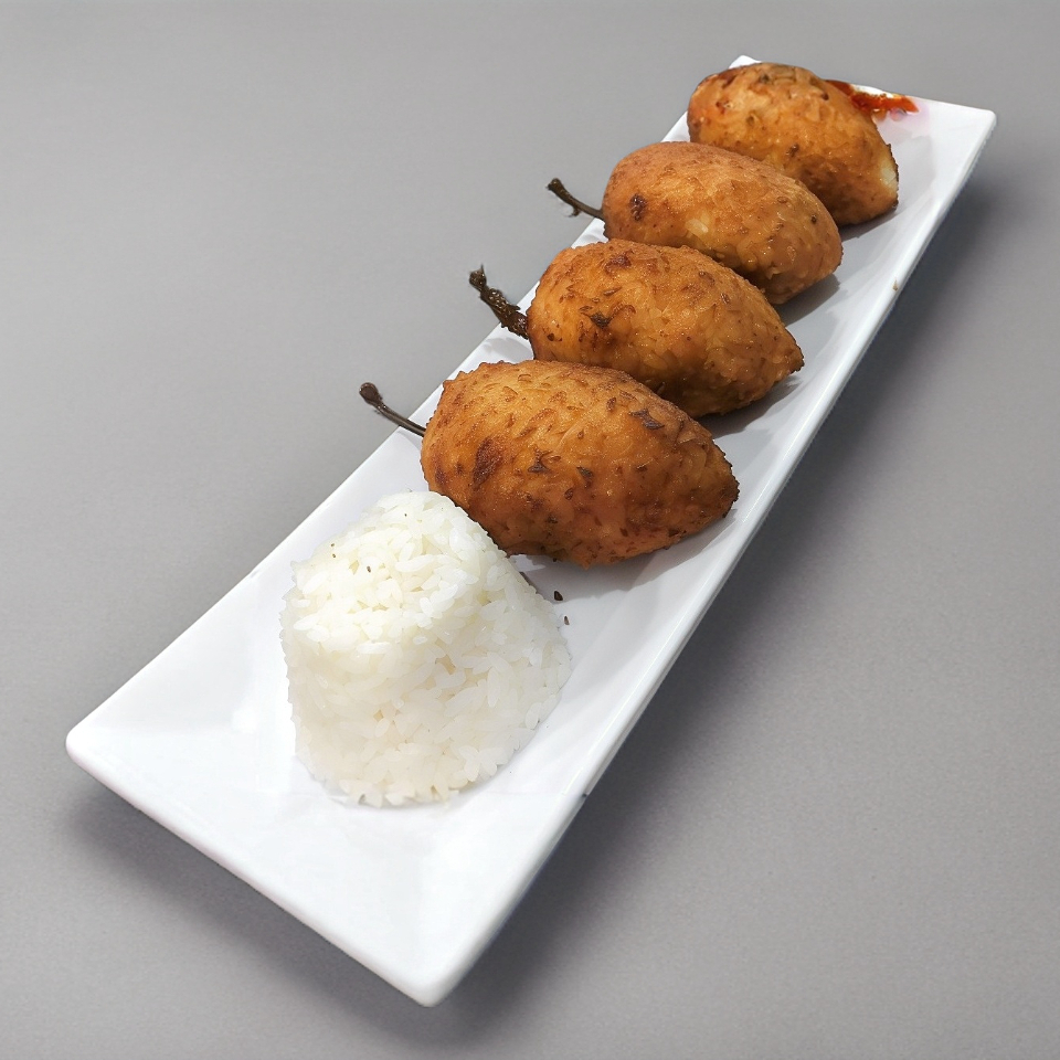 Bola de arroz, phila, tampico, pollo ,res y camarón. Empanizada.