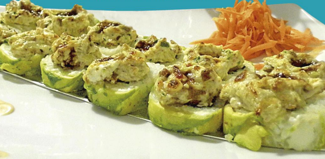 Por dentro aguacate, Phila, serrano, chipotle y cangrejo empanizado, coronado con Tampico