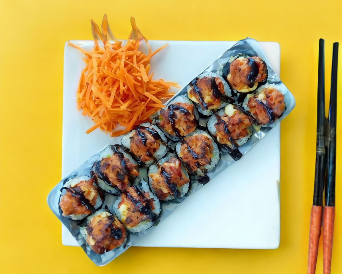 Rollo empanizado con dos ingredientes a elegir por dentro, tampico spicy arriba y coronado con cuadritos de queso gratinado.