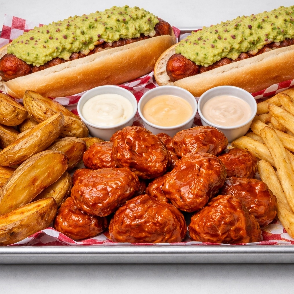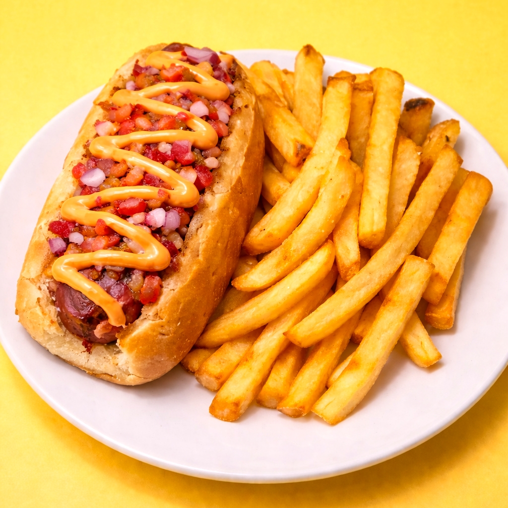 (hot dog clasico,boneles salsa a elegir,papas fritas,aderezo amarillo y capsu,+bebida a elegir)