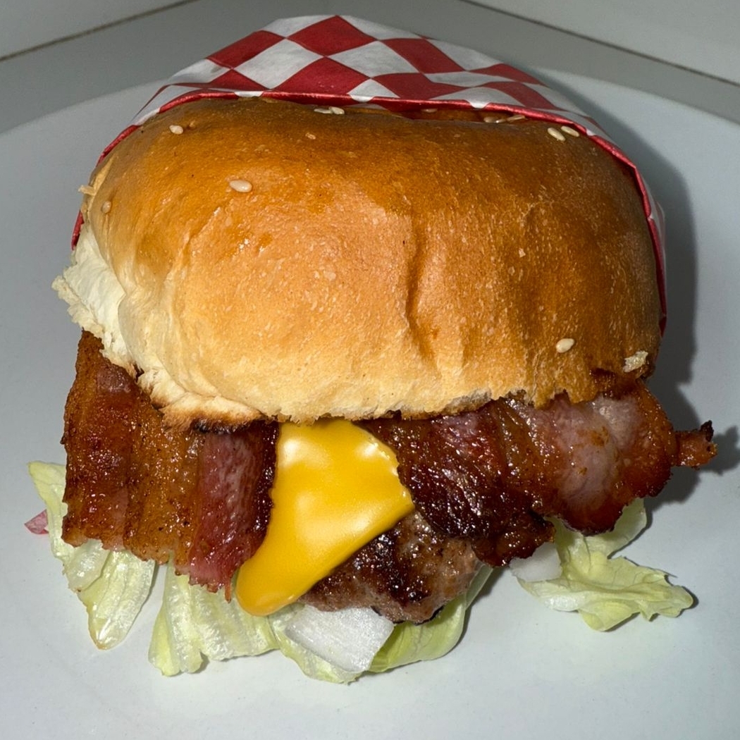 (pan casero,carne,queso americano,aros de cebolla,tocino y salsa bbq)