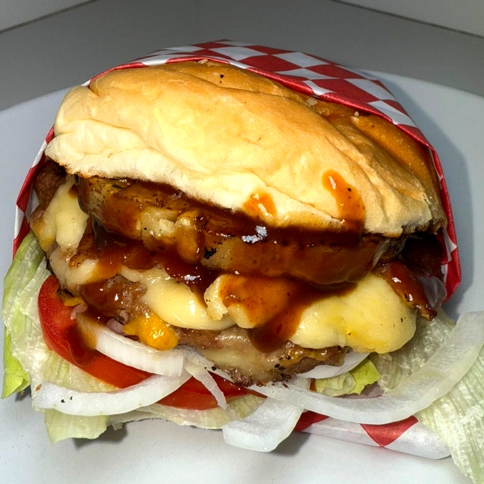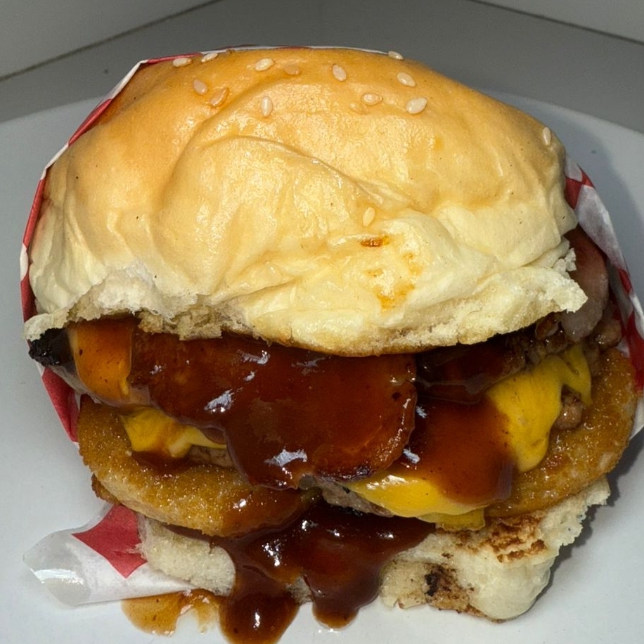 (pan casero,2 carnes,2queso americano,aros de cebolla,tocino y salsa bbq,aderezo amarillo y capsu)