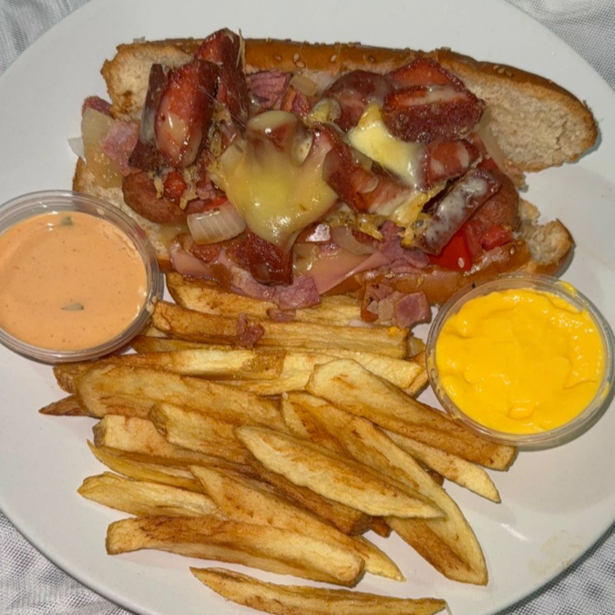 (pan casero,salchicha de pavo,tocino,tomate,cebolla cruda,gratinado de queso chihuahua con salchicha para asar,papas fritas)