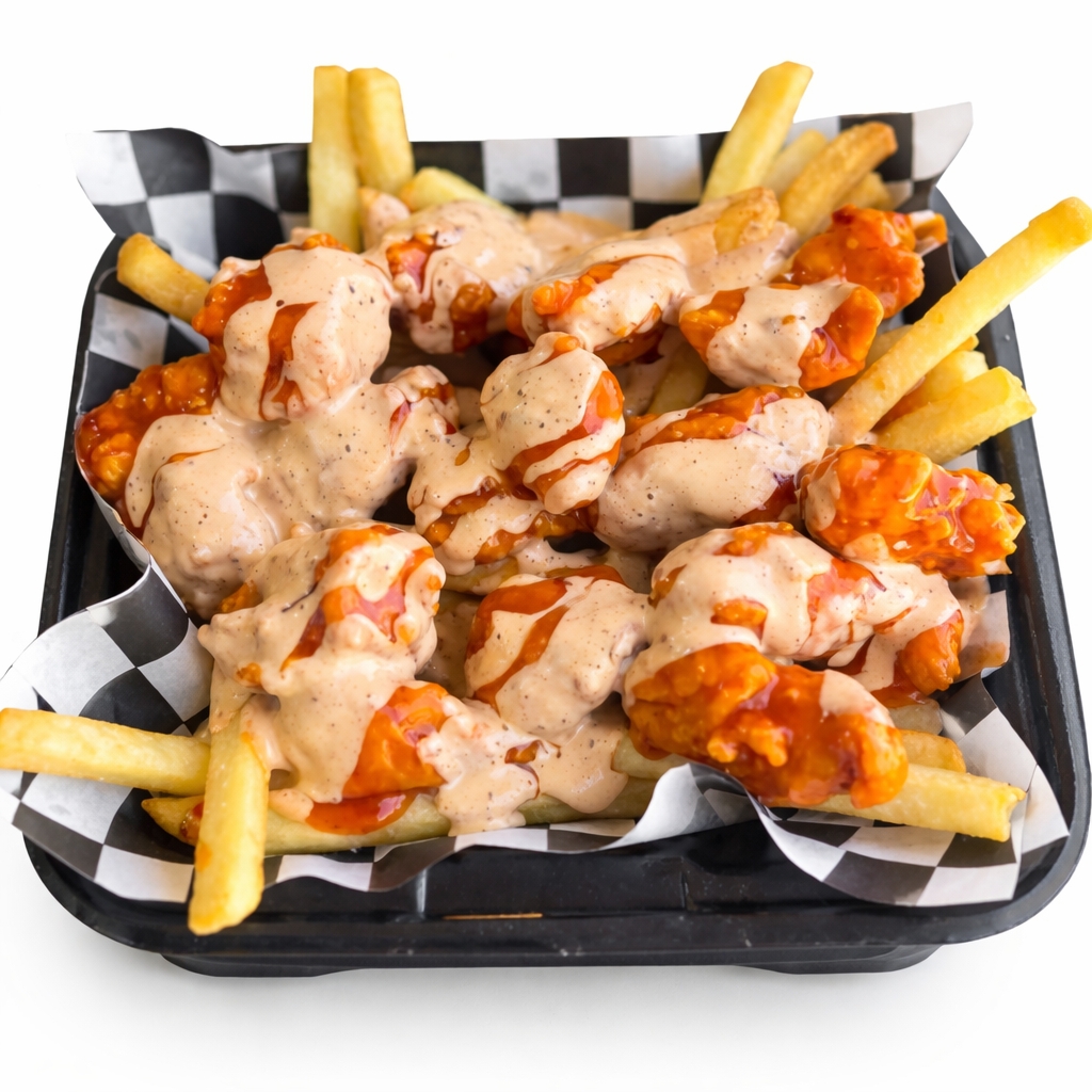 (papas a la francesa cubiertas con 300 gr de boneles,bañados en salsa de tu eleccion y bañadas en salsa nuestra especial.