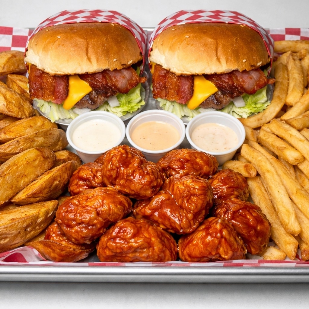 2 clasicc burguer,250 gr de boneles,papas a la francesa,papas gajo,aderezos.
