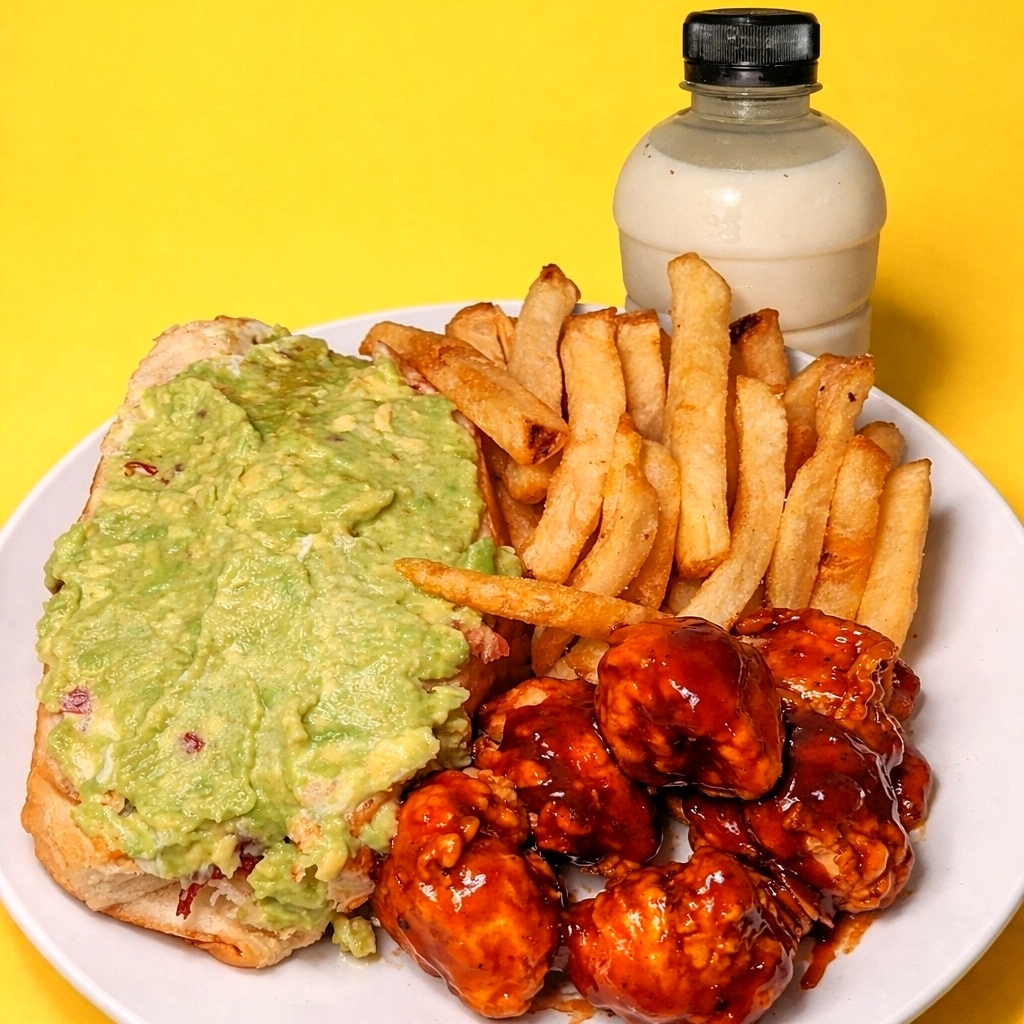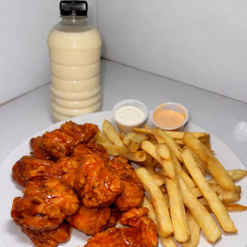 (250gr de pechuga de pollo,salsa a elegir,papas fritas,aderezo chipotle,aderezo ranch,bebida a elegir)