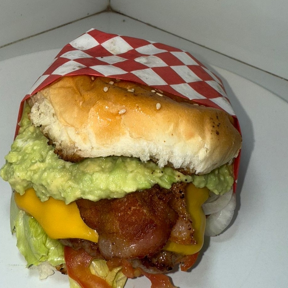 (pan casero,carne,queso americano,tocino,guacamole,aderezo especial,lechuga,tomate,cebolla)