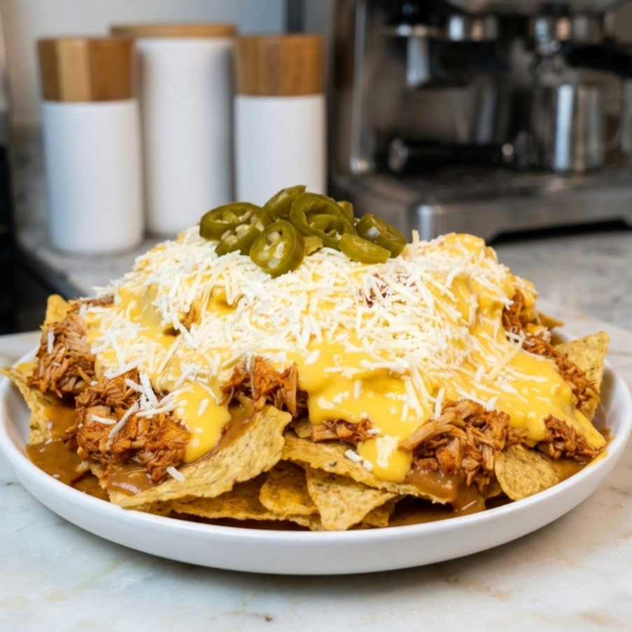 Nachos con Cochinita: Crujientes totopos bañados en delicioso queso amarillo y queso rallado, acompañados de nuestros tradicionales frijoles puercos, cochinita pibil de la casa y el toque perfecto de chiles jalapeños en rajas