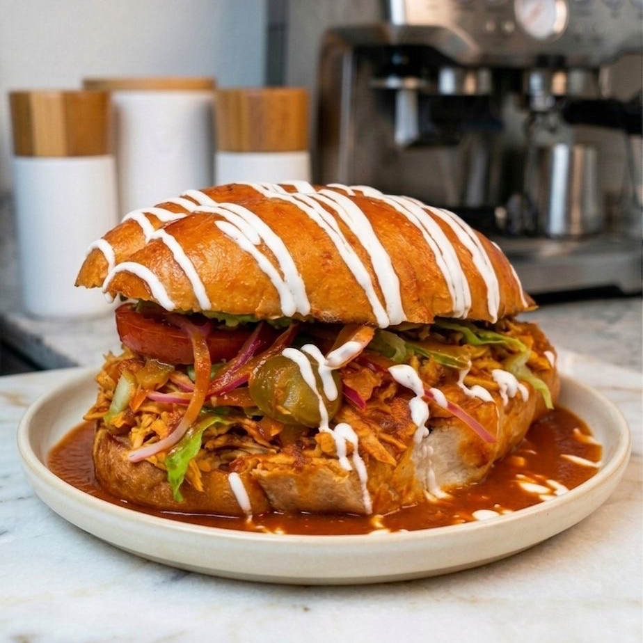 Pan en mantequilla,Bañada en salsa de jitomate de la casa, cochinita pibil,Cebolla morada curtida,Aguacate fresco,Un toque de crema.