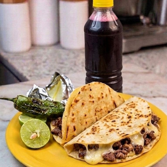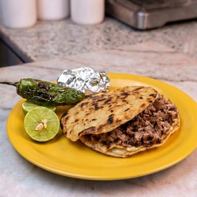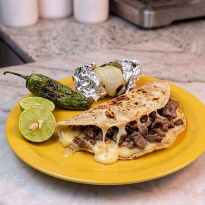 Tortilla de maíz doradita a las brasas, rellena de abundante carne de res corte Sirloin y doble capa de queso derretido por ambos lados. Servida con nuestro guacamole, pepinos, limones, cebollita y salsas .