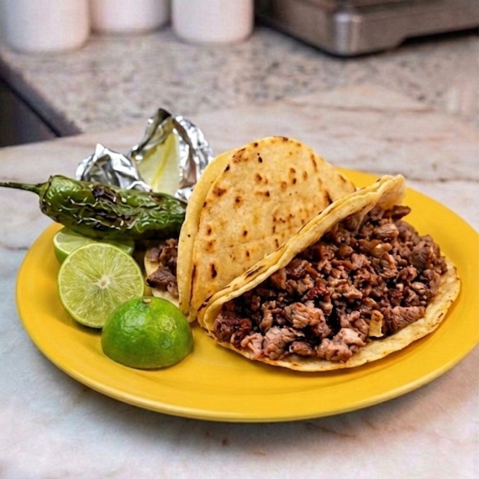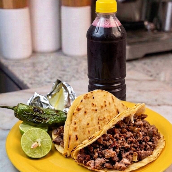 🌮 1 Taco de Asada Sirloin (bien servido) + 1 Quesadilla doradita + Agua de Jamaica natural. Incluye: Guacamole, pepinos, limones, cebollita y salsas.