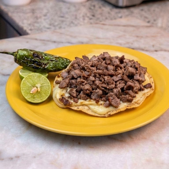 Dos tortillas de maíz doraditas a las brasas con una base de queso derretido (tipo costra) en la parte inferior. Rellenas con nuestra jugosa carne de res Sirloin. Servido con guacamole, pepinos, limones, cebollita y salsas.