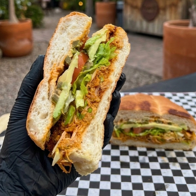 "Deliciosa torta en pan artesanal dorado a la mantequilla con una generosa porción de auténtica cochinita pibil. Servida con queso americano, mayonesa, aguacate fresco, tomate, lechuga, cebolla morada curtida y un toque de limón. ¡Incluye papas fritas y chiles jalapeños!"