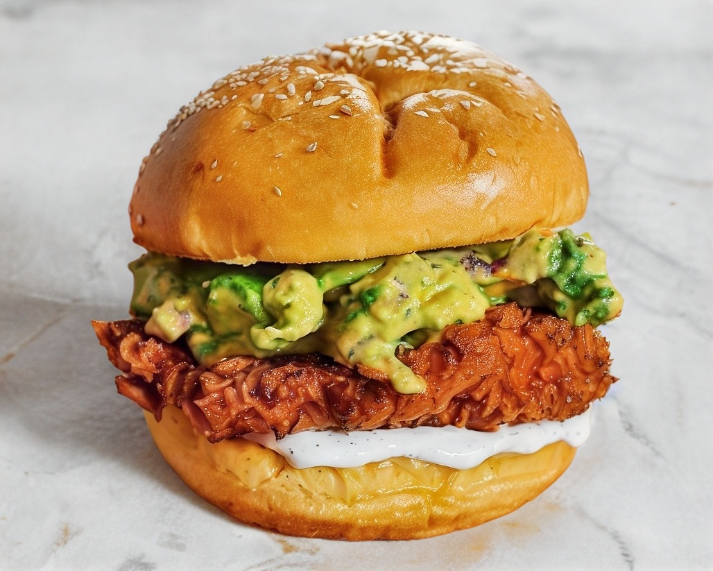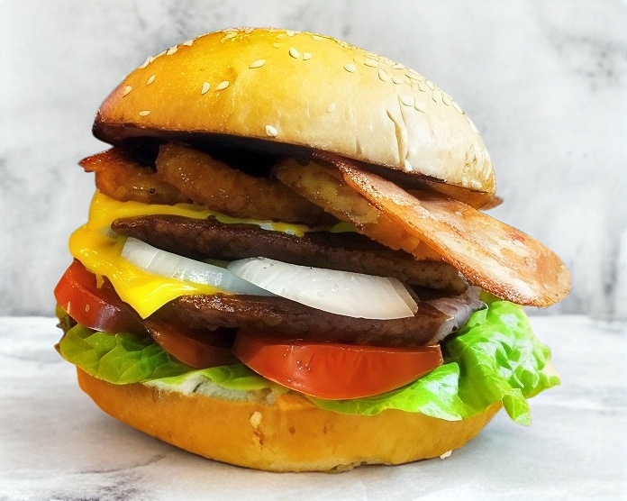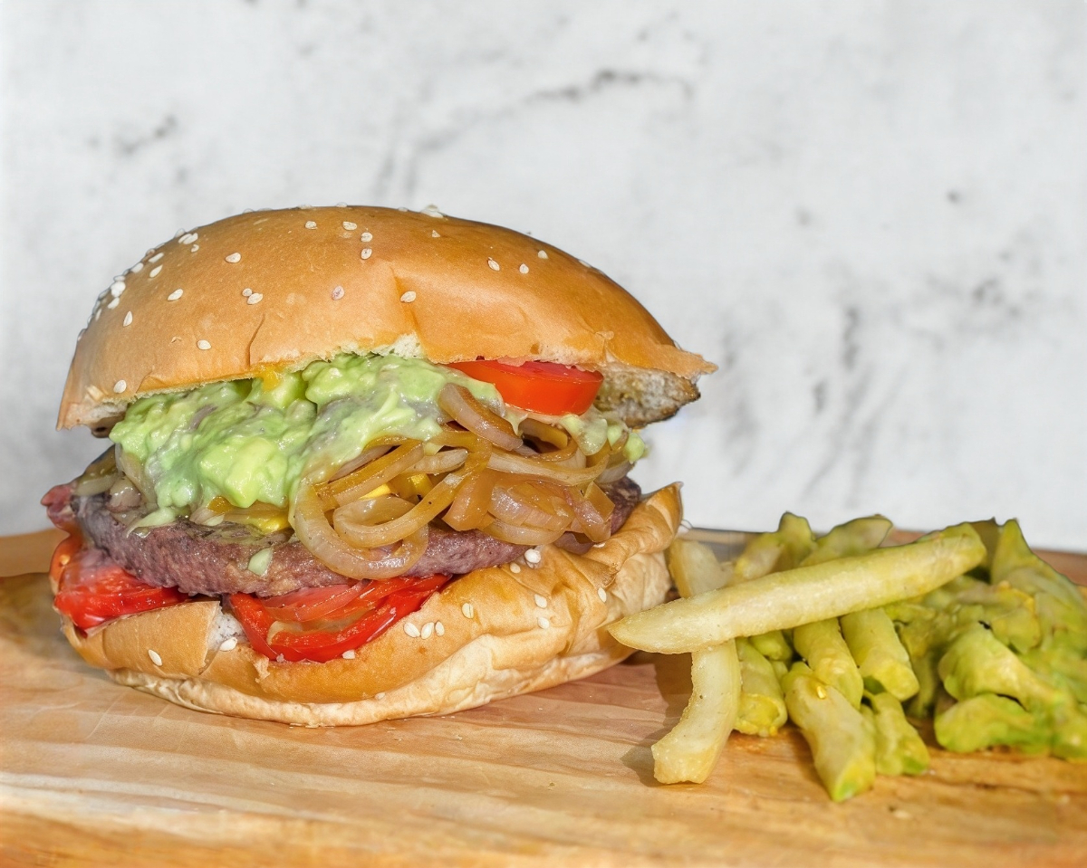 Carne de res, queso americano, lechuga, tomate, cebolla, guacamole y tocino. Acompañada de papas a la Francesa