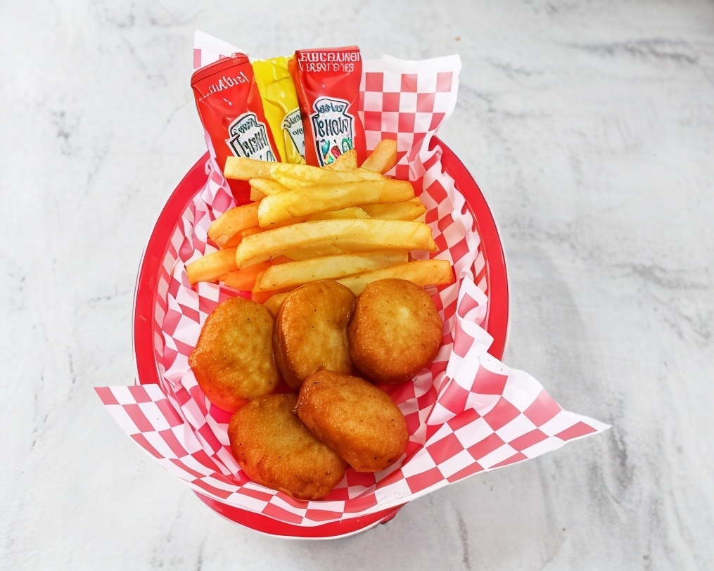 10 piezas de Nuggets, acompañado de papas a la francesa.