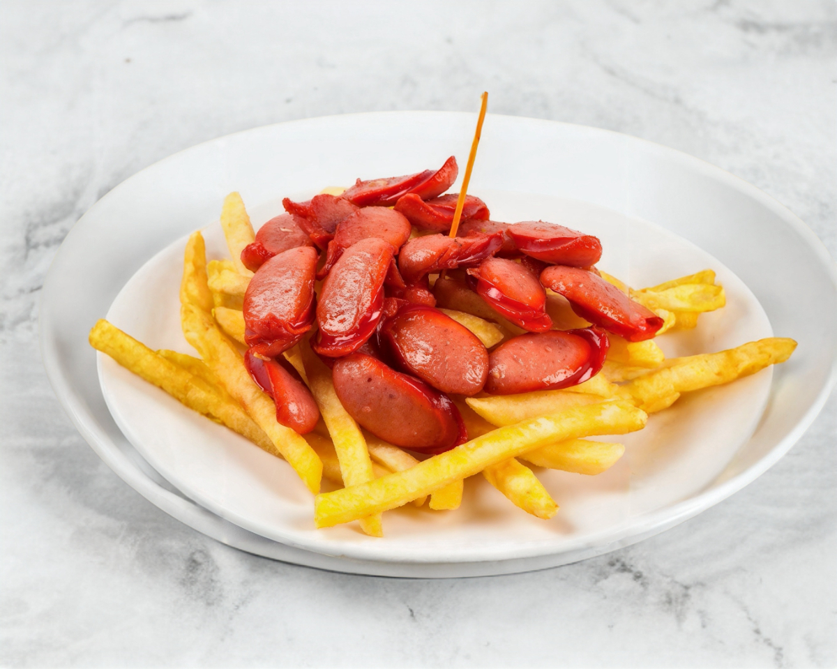 300 gramos de papas y salchichas picadas asadas.