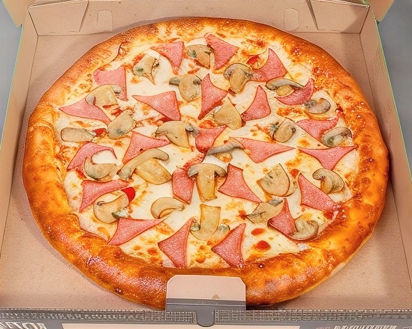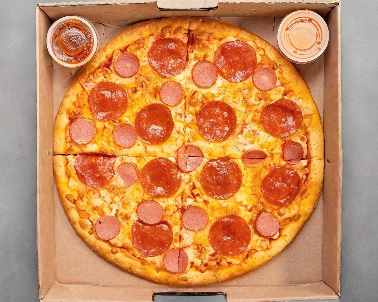Pizza familiar de 8 rebanadas de Peperonni, incluye 2 aderezo y 2 salsa.